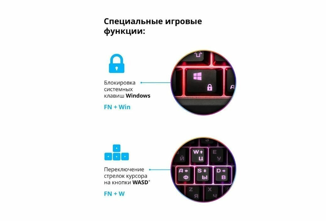 | Дополнительная информация | расширенная RGB-подсветка символов и клавиш, возможность выключения подсветки, позолоченный USB-коннектор, плетеная структура кабеля, ферритовый фильтр помех, ресурс до 5 миллионов нажатий, игровые функции: блокировка системных клавиш Windows и переключение стрелок курсора на кнопки WASD |