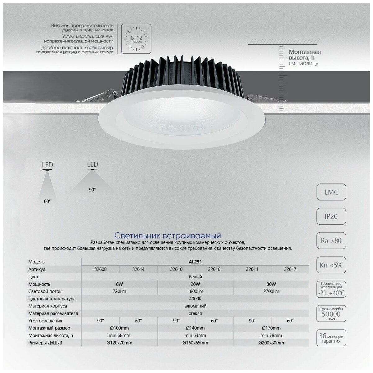 Светильник встраиваемый светодиодный 30W, 2700Lm, 4000K, 90 градусов, белый, AL251 с драйвером в комплекте
