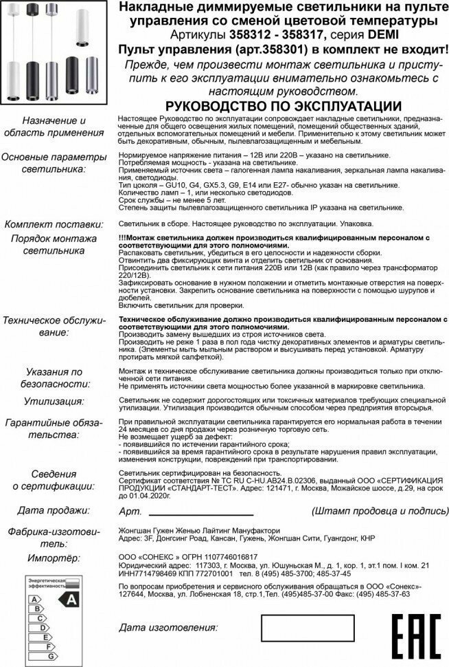 | Дополнительная информация | изменение цветовой температуры 3000-6500 К |