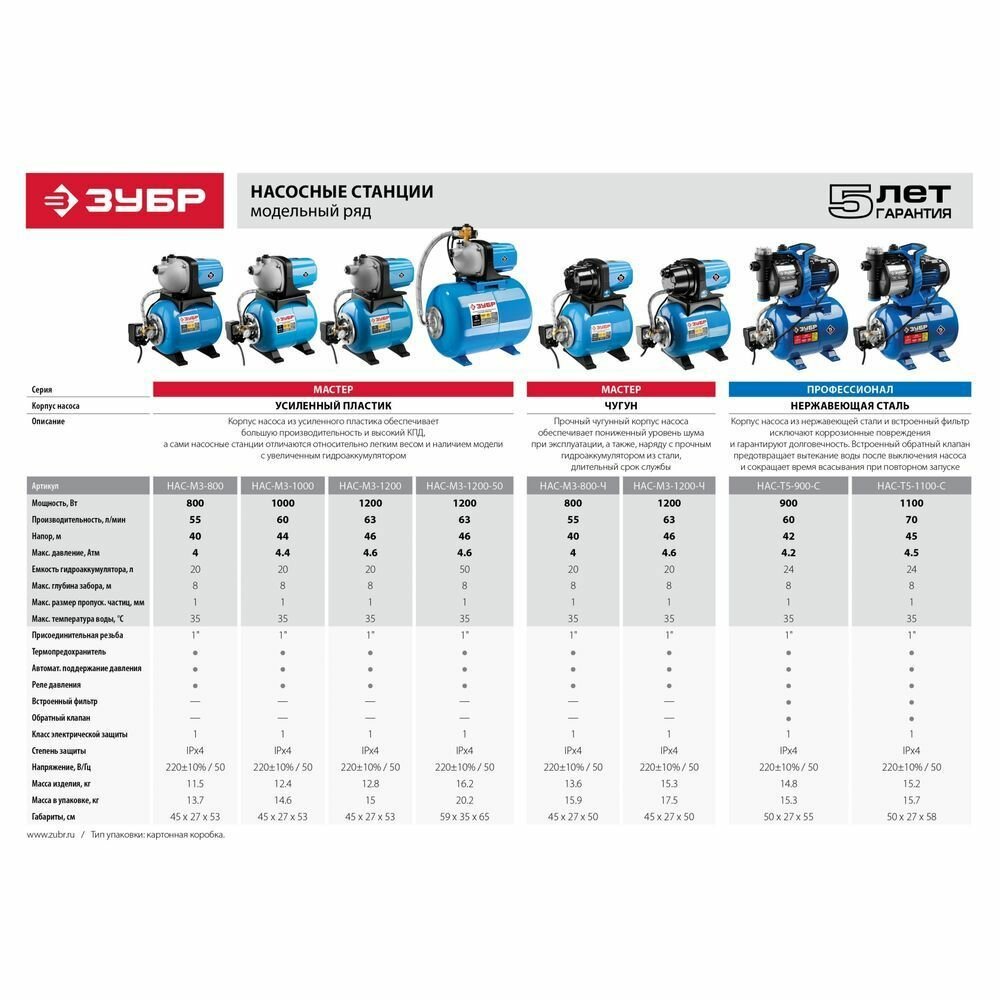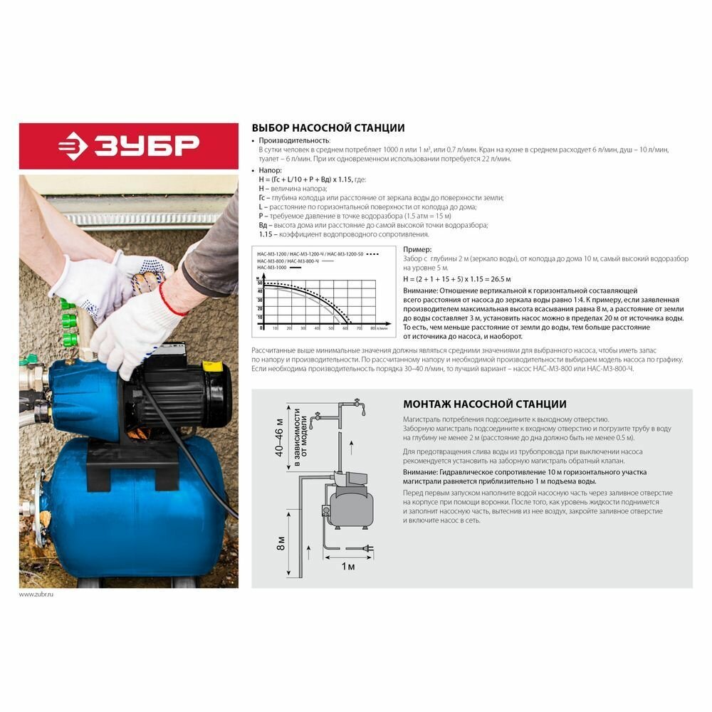 ЗУБР 1200 Вт, 63 л/мин, станция насосная М3 НАС-М3-1200-Ч Мастер