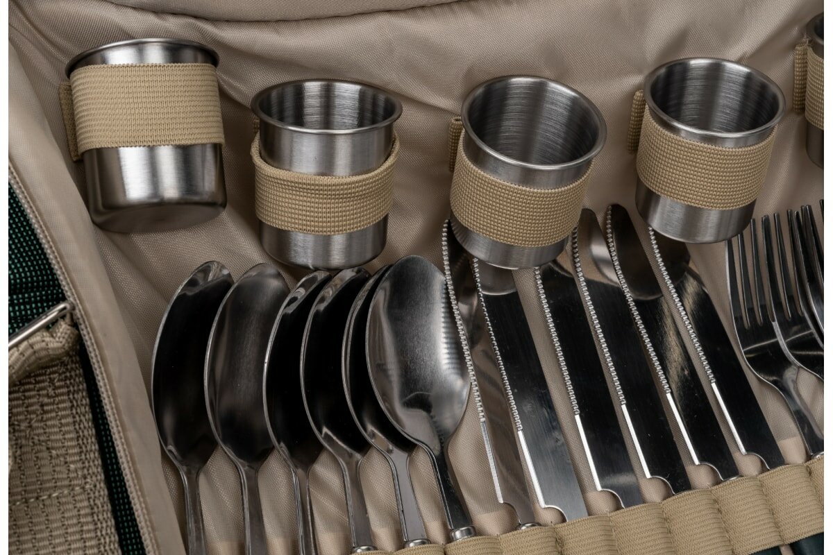 Для походного набора думал будет на много меньше толщина металла, а нет тарелки глубокие и не тяжёлые, полноценные вилки и большие ложки, порадовала досточка для нарезки, салфетки хорошего качества и сама сумка с отделом для продуктов очень качественная. Набор отличный. |