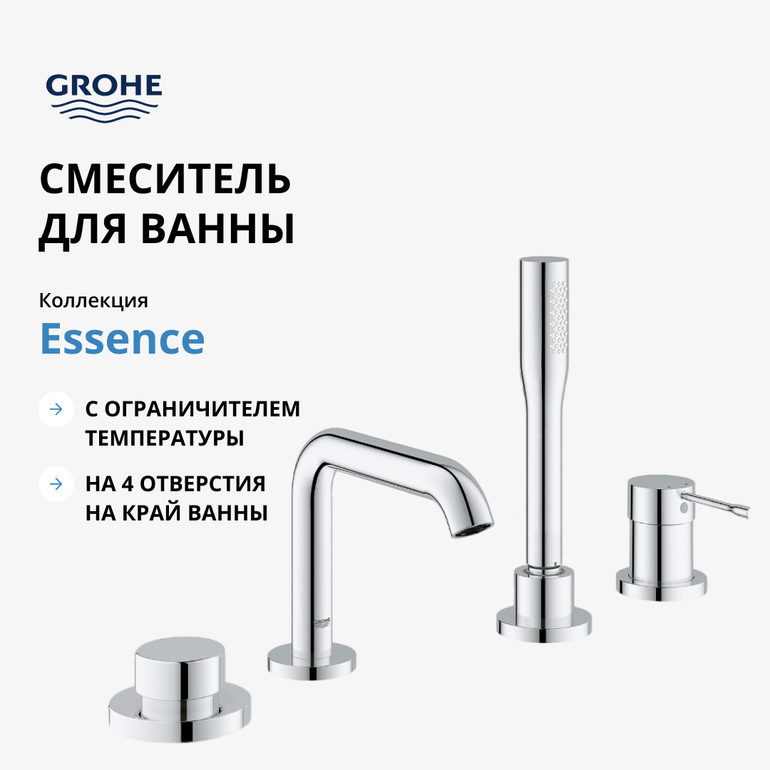 Смеситель для ванны Grohe Essence+ на 4 отверстия с душевым гарнитуром и изливом (на бортик ванны), хром (19578001)