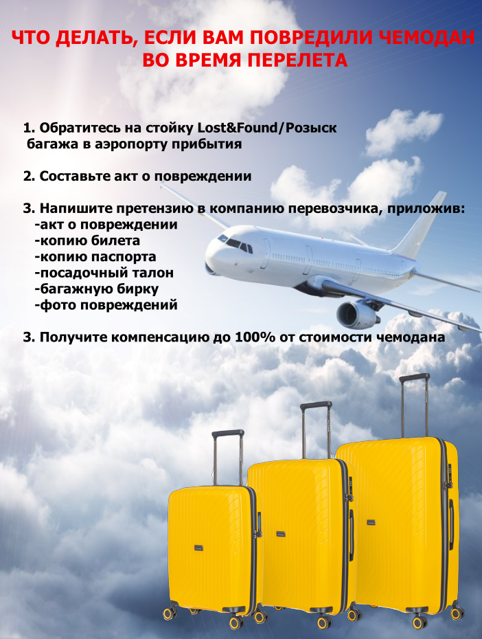 | Дополнительная информация | Габариты измеряются по внешним размерам: высота от пола до верхней точки (включая колеса и не учитывая выдвижную ручку), ширина и глубина - по максимально выступающим точкам чемодана. Мы указываем габариты именно так, как их замеряет любая авиакомпания для проверки габаритов багажа! |
