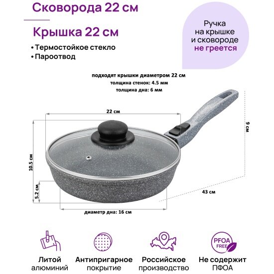 Сковорода глубокая Elan Gallery гармония вкуса Серый мрамор, с крышкой, съёмная ручка, 22 см интересное: