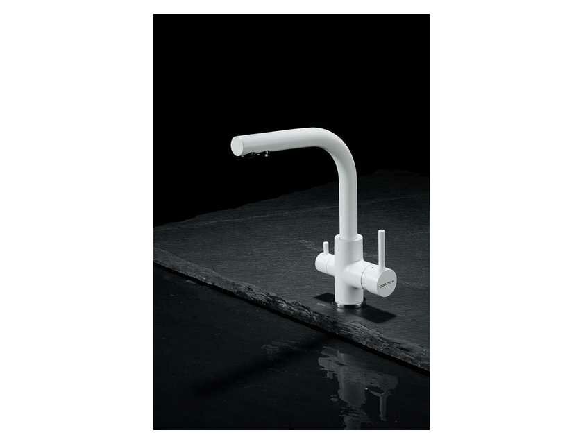 Смеситель для кухни Paulmark ESSEN, подключение к фильтру питьевой воды с отдельным каналом и выпуском, высокий поворотный излив, латунь, на мойку, белый матовый полностью, Es213011-431TW