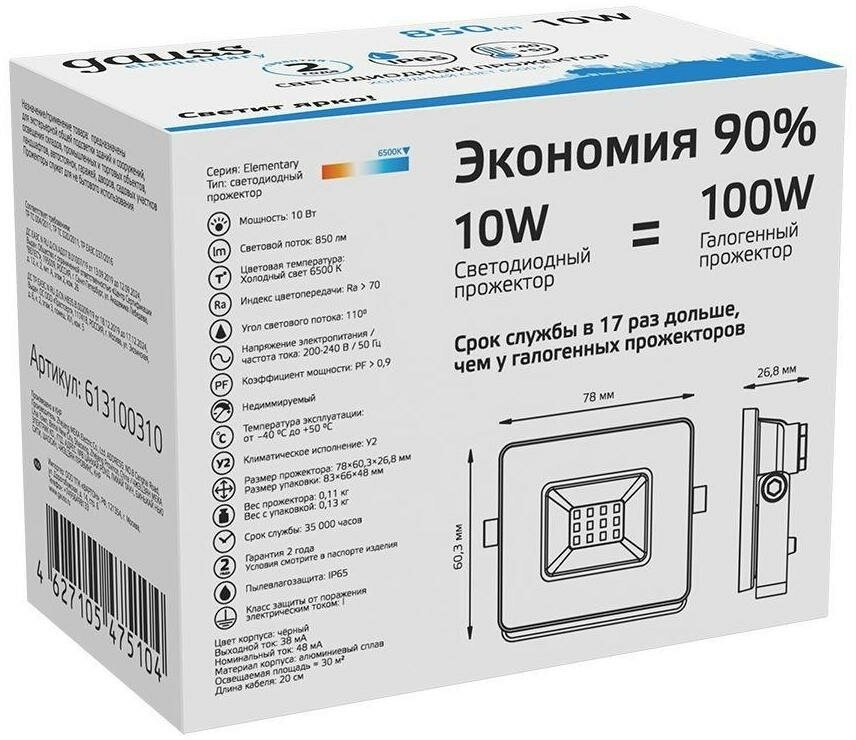 Прожектор светодиодный Gauss Elementary 10W 850lm IP65 6500К черный интересное: