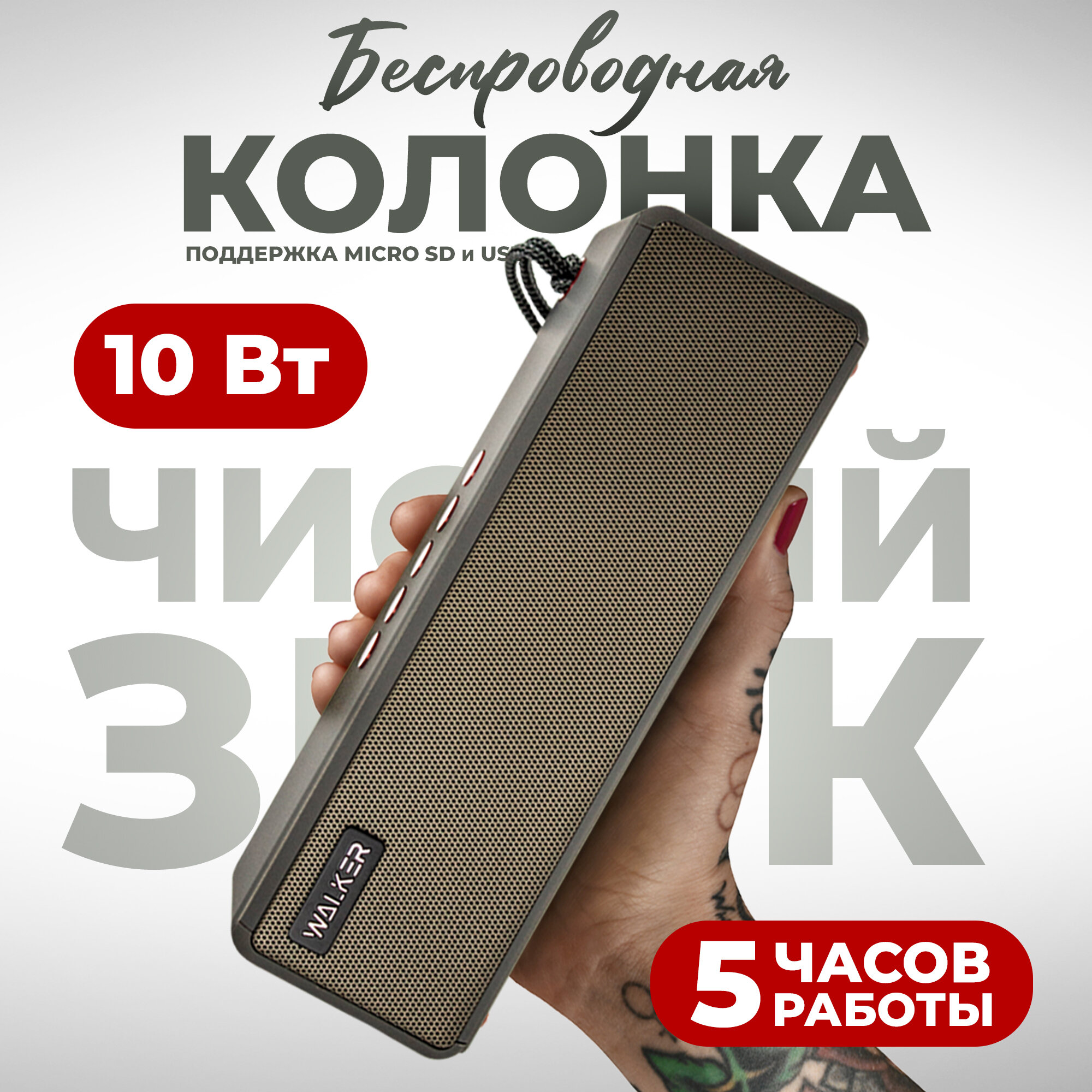 СохранитьПортативная колонка bluetooth 5.0, WALKER WSP-130, 2 динамика по 5Вт, блютуз, с подсветкой беспроводная, колонка музыкальная как jbl акустика, серая интересное: