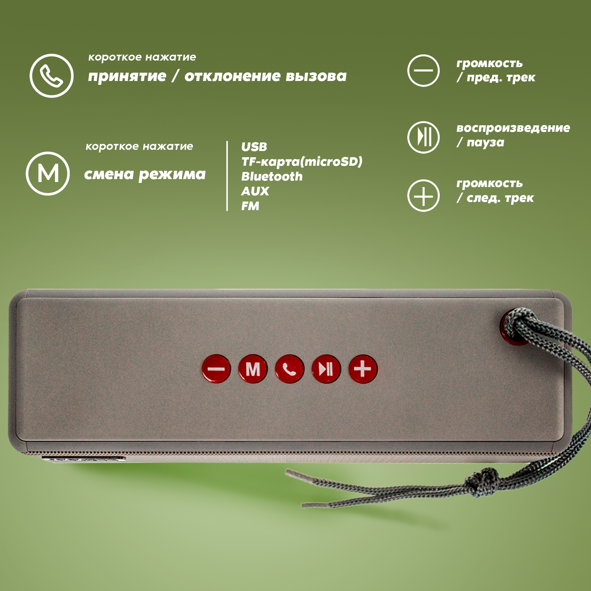 | Плюсы: | Аккамулятор хорошо держит, стильно выгледит, громкая, звук меня устраивает |