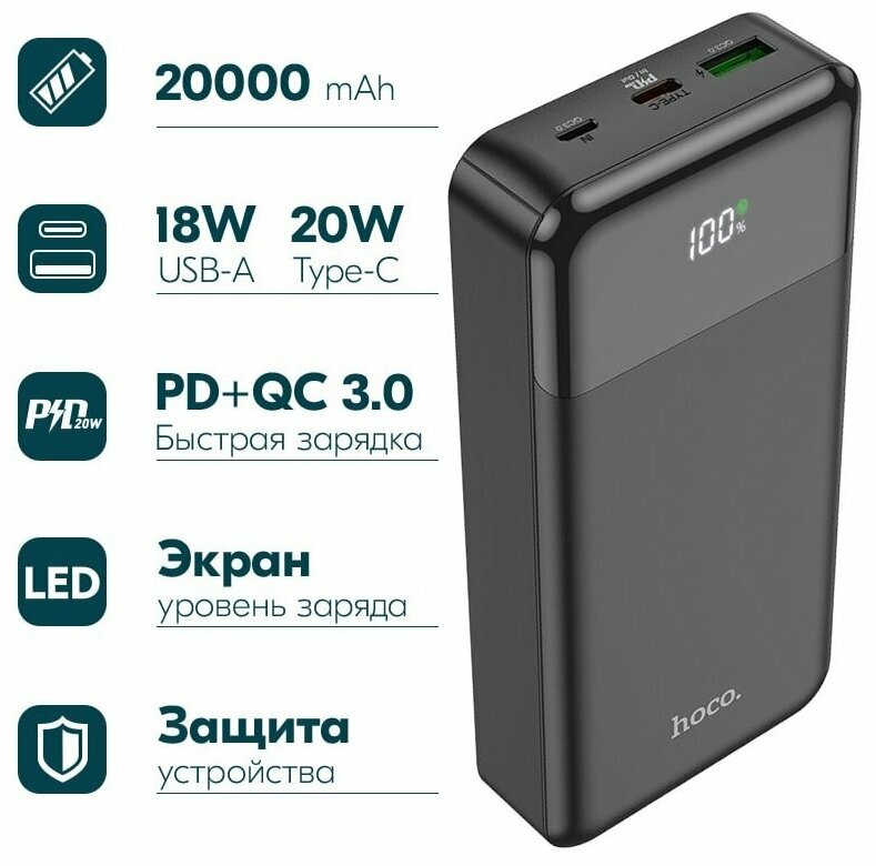Универсальный Доп. Аккумулятор 20000mAh, J102A, HOCO, выход: 1 USB (18W)+1 PD 20W, черный