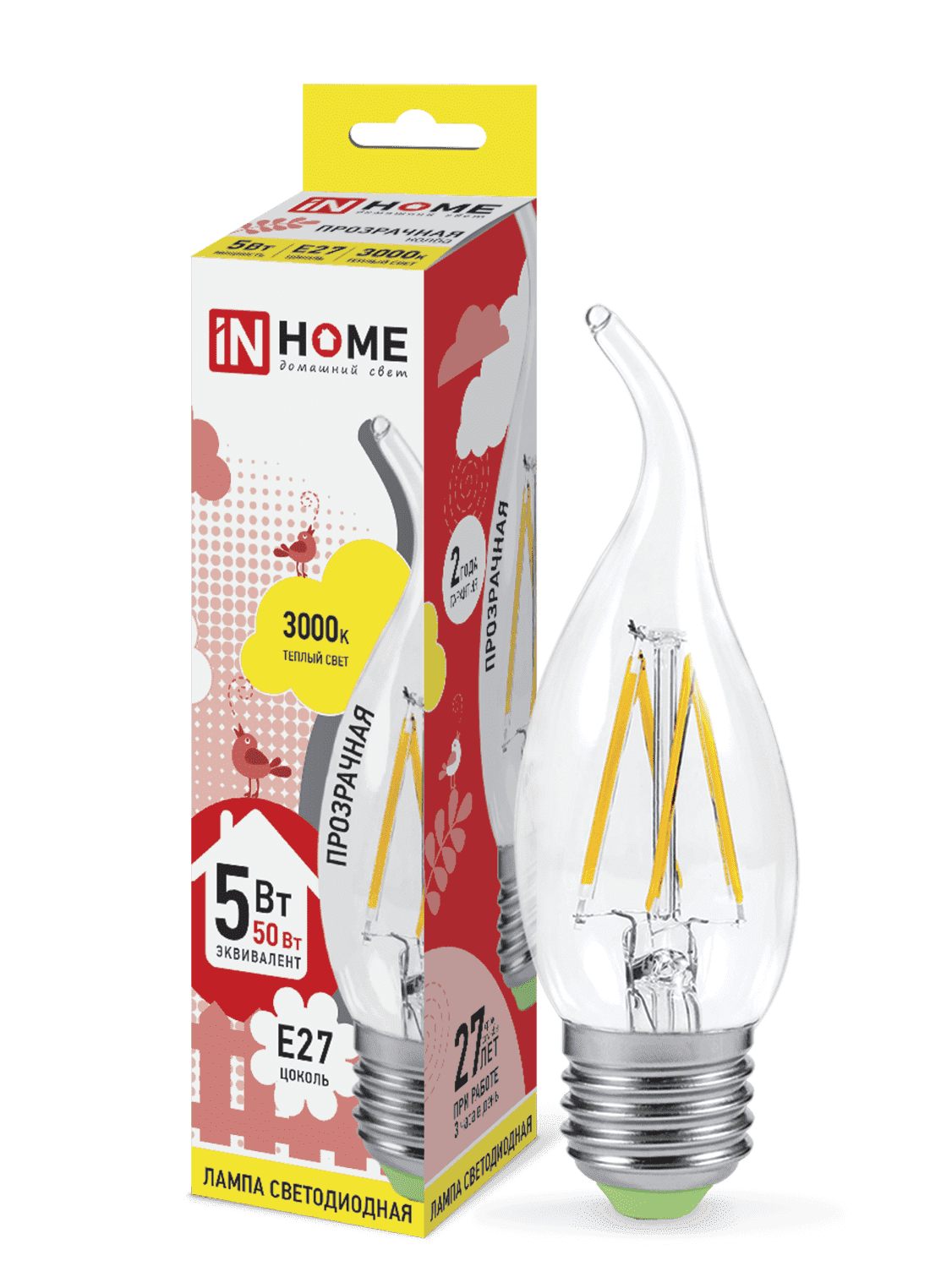 IN HOME Лампа светодиодная led-свеча на ветру-deco 5Вт 230В Е27 3000К 450Лм прозрачная 4690612007649