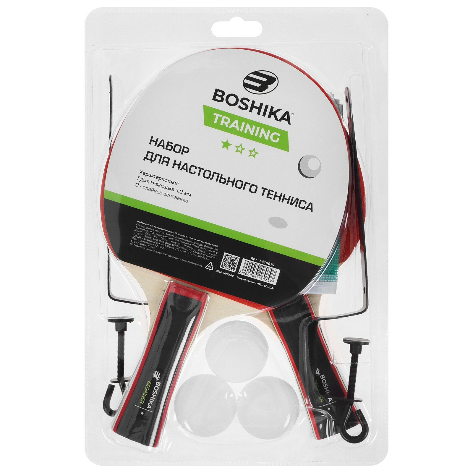 Набор для настольного тенниса BOSHIKA Training: 2 ракетки, 3 мяча, сетка, крепление