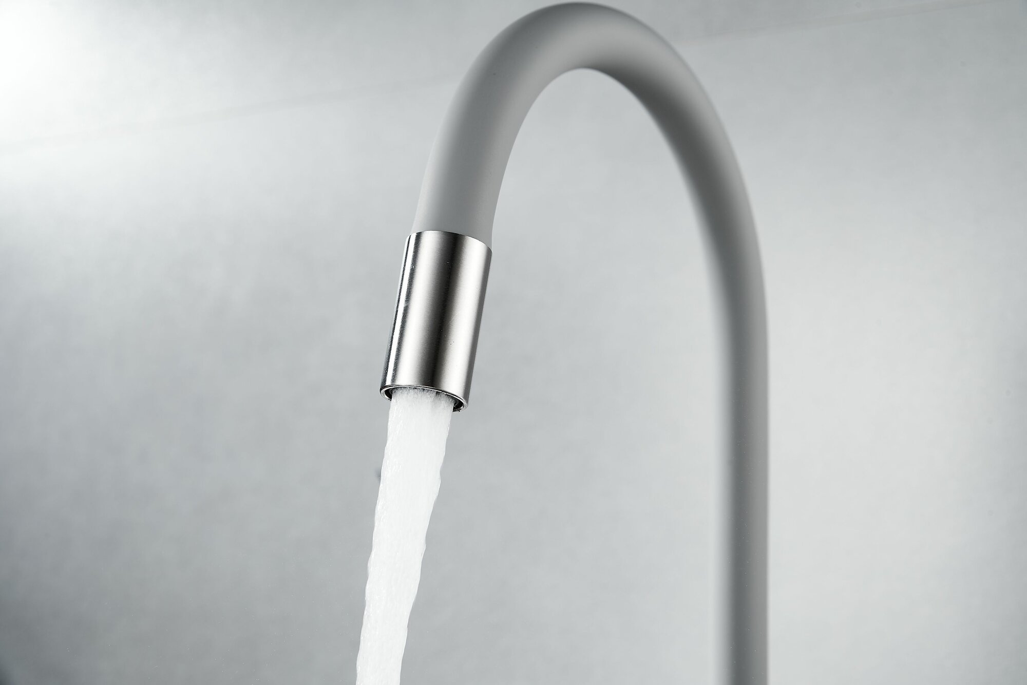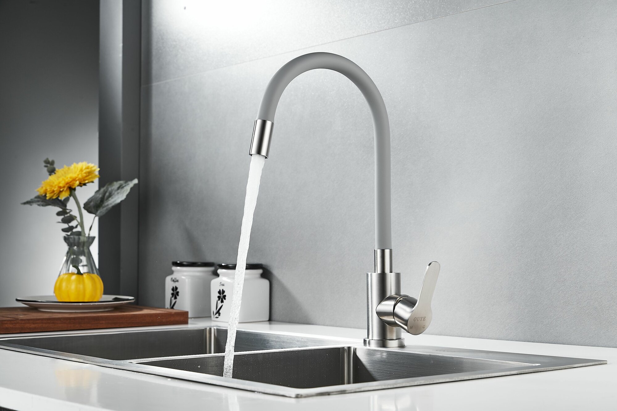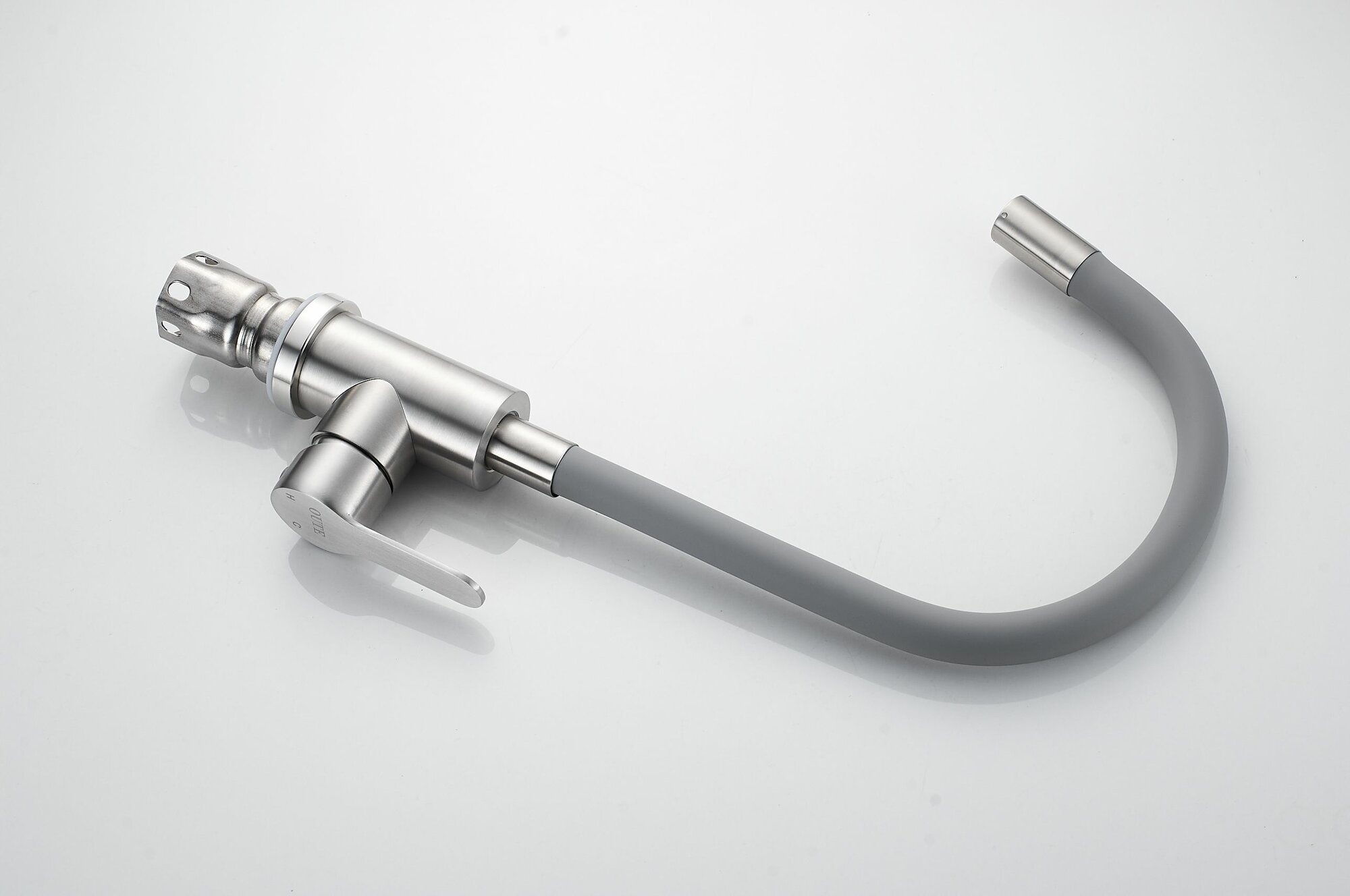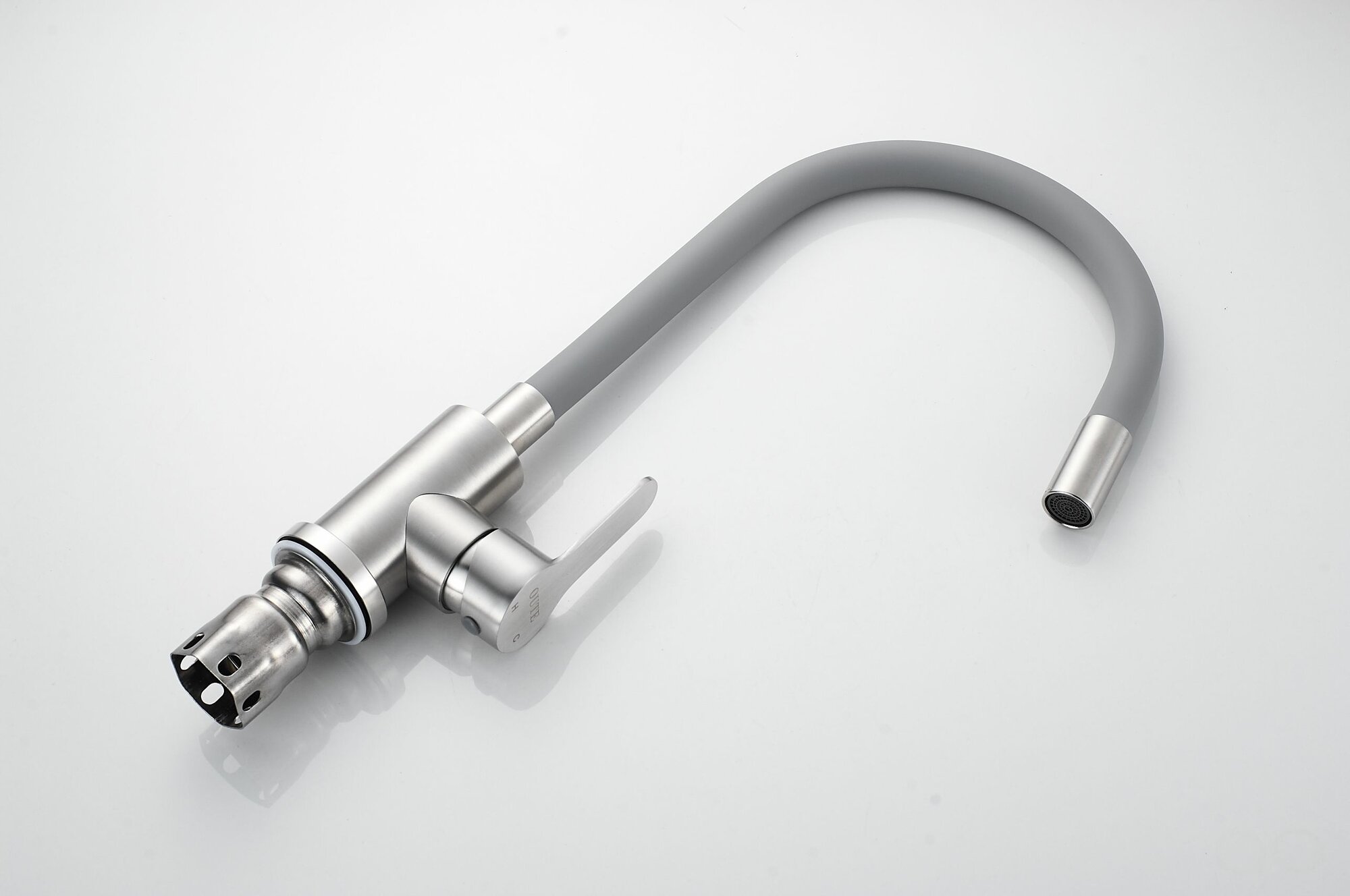 Смеситель для кухни OUTE из нержавеющей стали SUS 304 цвет матовый хром с серым гибким силиконовым изливом