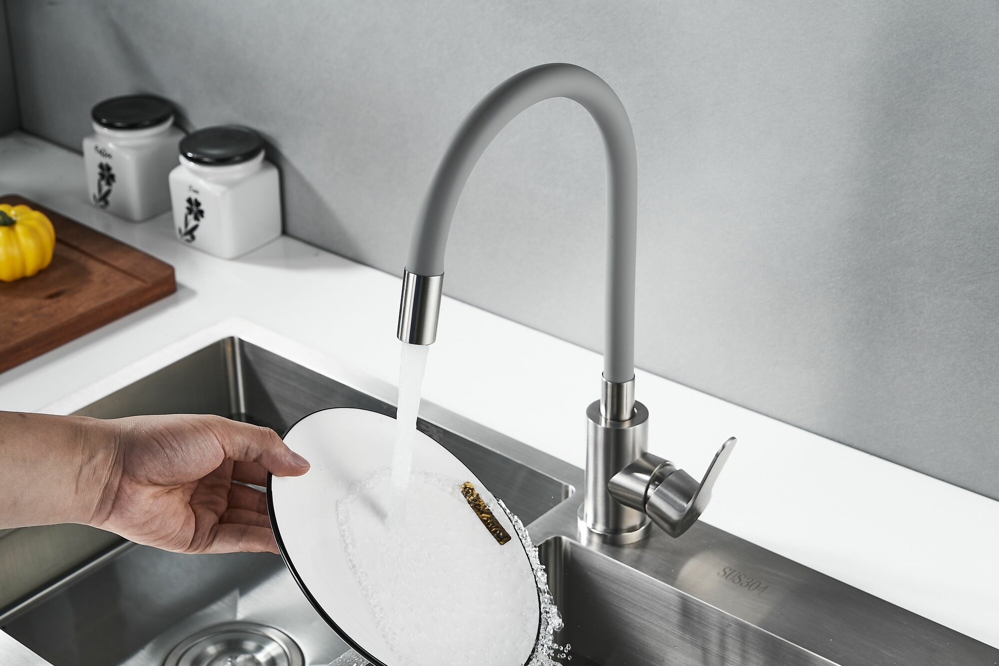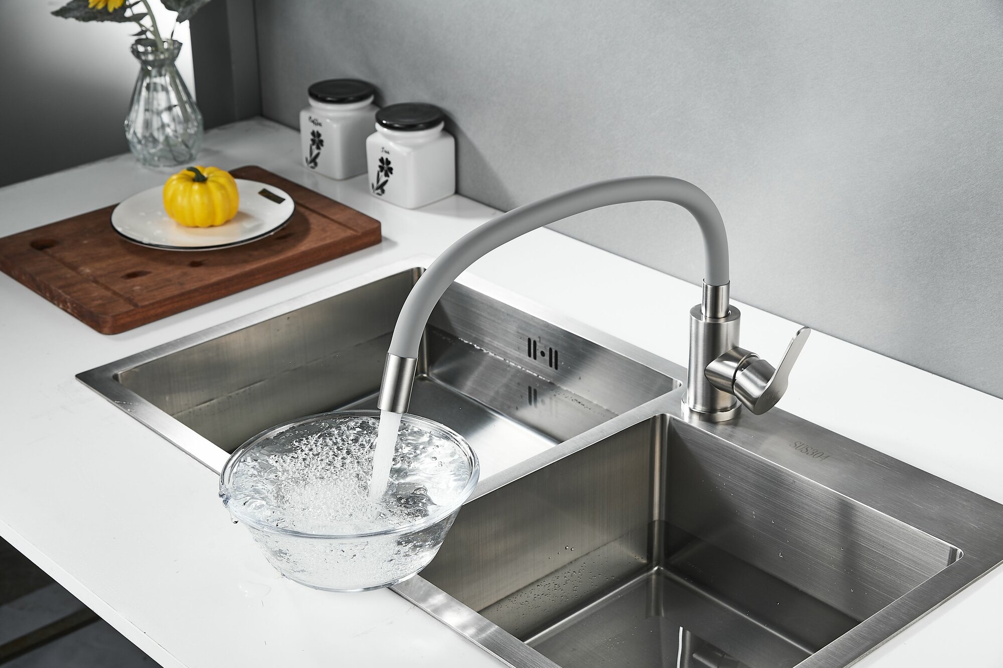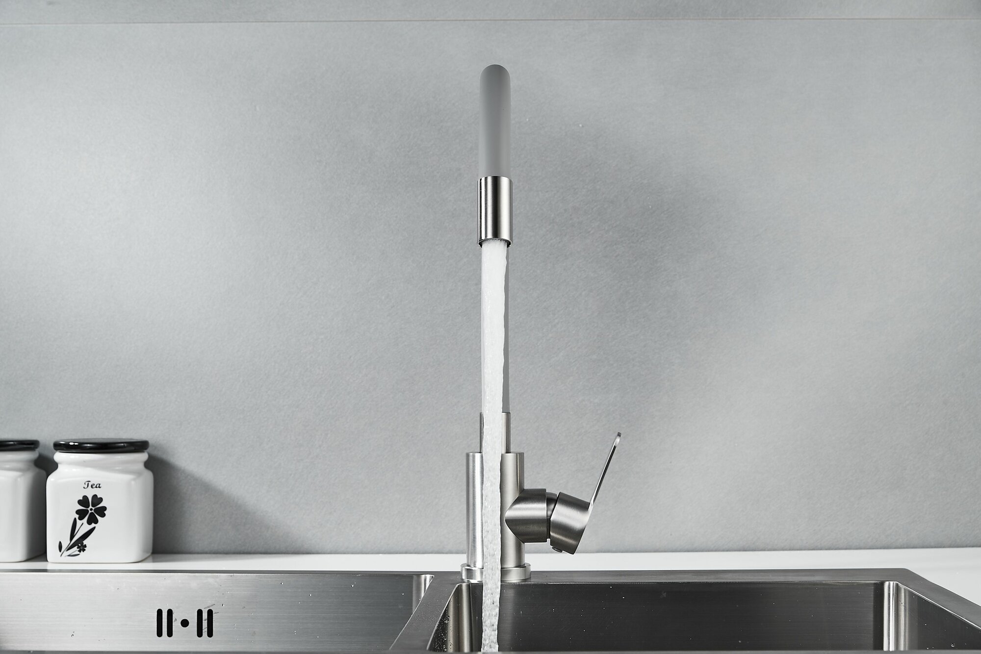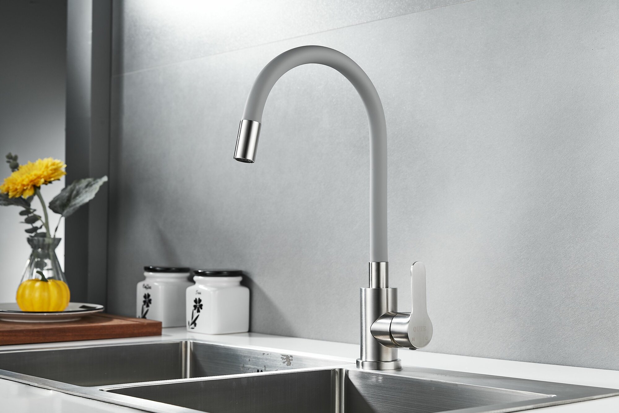 Смеситель для кухни OUTE из нержавеющей стали SUS 304 цвет матовый хром с серым гибким силиконовым изливом