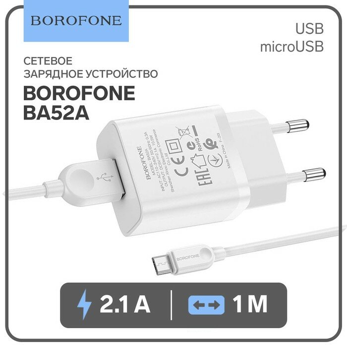 Сетевое зарядное устройство Borofone BA52A, USB, 2.1 А, кабель microUSB, 1 м, белое 9088832