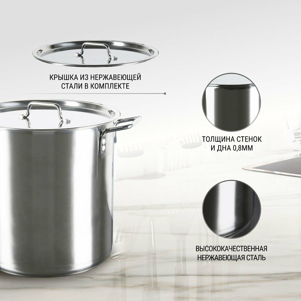 Кастрюля нержавеющая сталь, 20 л, с крышкой, крышка сталь, цилиндр, Катунь, Общепит, КТ-ОБ-22, металлик