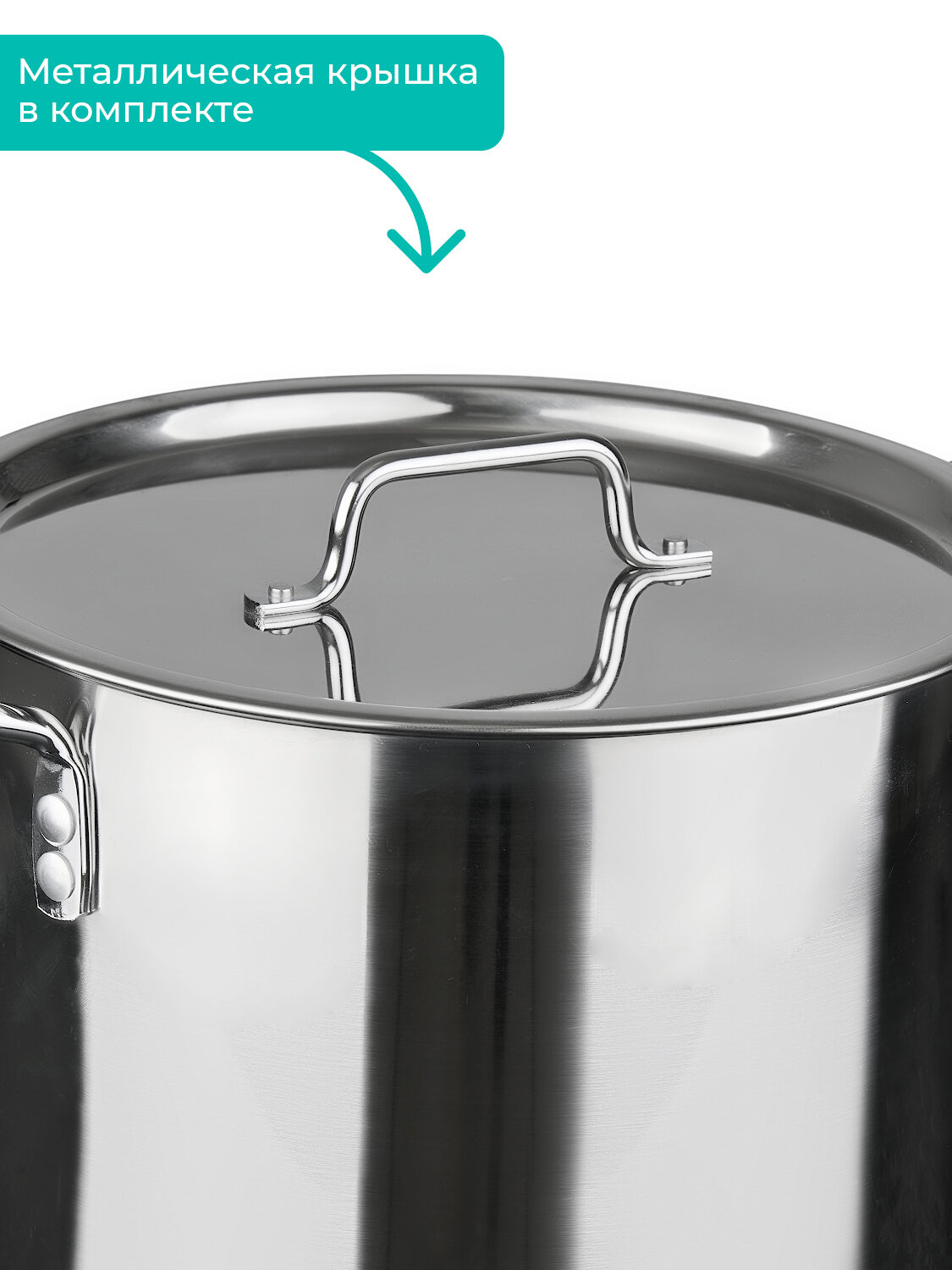 Кастрюля нержавеющая 50л d-50 h-28,5 общепит сварная с металлической крышкой клепаные ручки