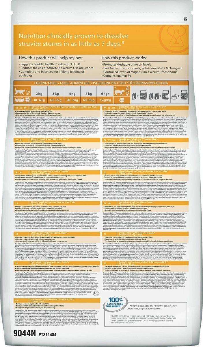 | Состав | злаки, мясо и производные животного происхождения, экстракты растительного белка, масла и жиры, минералы. Подкисляющее мочу вещество: сульфат кальция, калия хлорид, хлорид холина, DL-метионин, курица 32% |