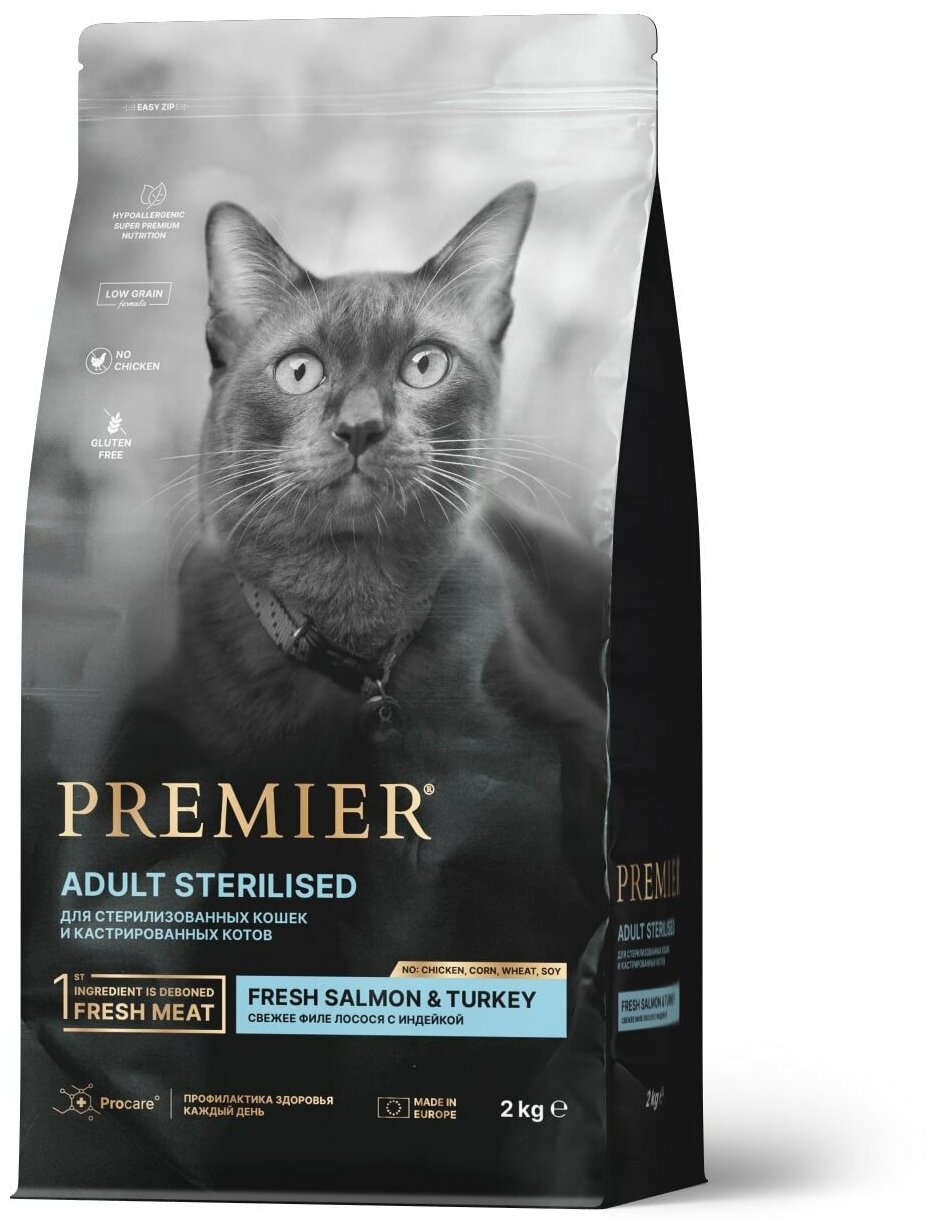 Купить Premier Cat Salmon&Turkey STERILISED корм для стерилизованных кошек, свежее филе лосося с индейкой 2кг