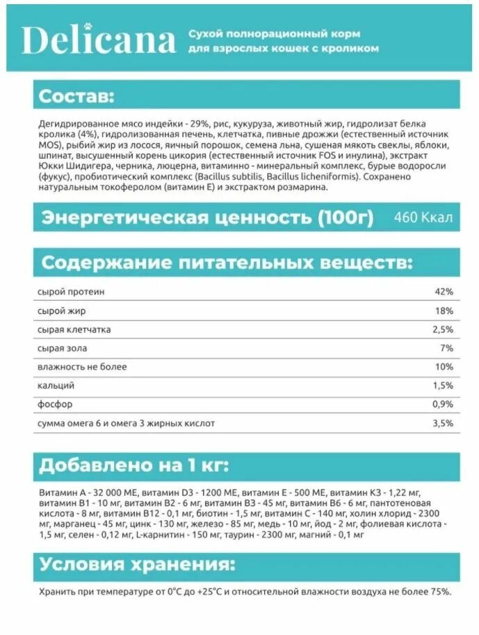 DELICANA Корм сухой для кошек Кролик с витаминами, минералами и микроэлементами 400 гр