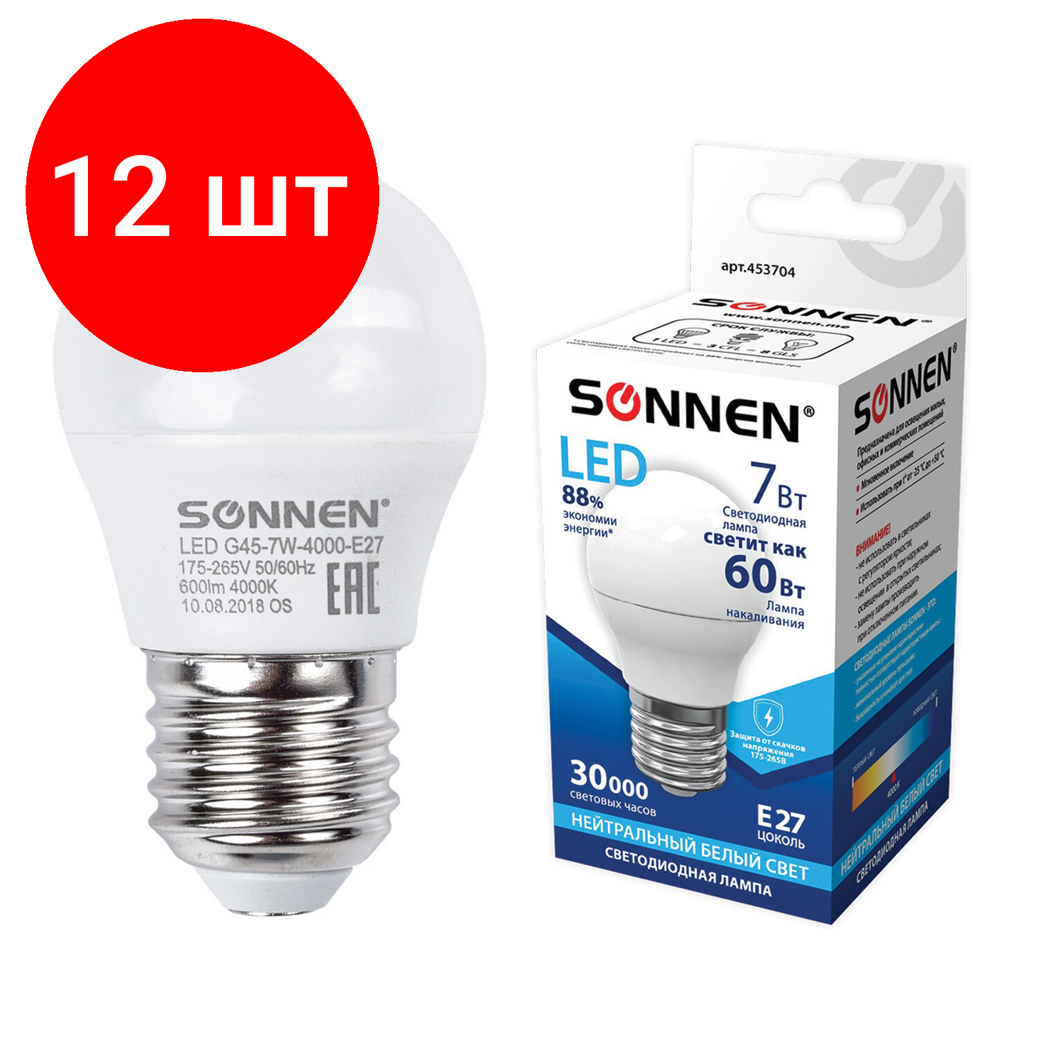 Лампа светодиодная SONNEN, 7 (60) Вт, цоколь E27, шар, нейтральный белый свет, 30000 ч, LED G45-7W-4000-E27, 453704 Комплект - 10 шт .