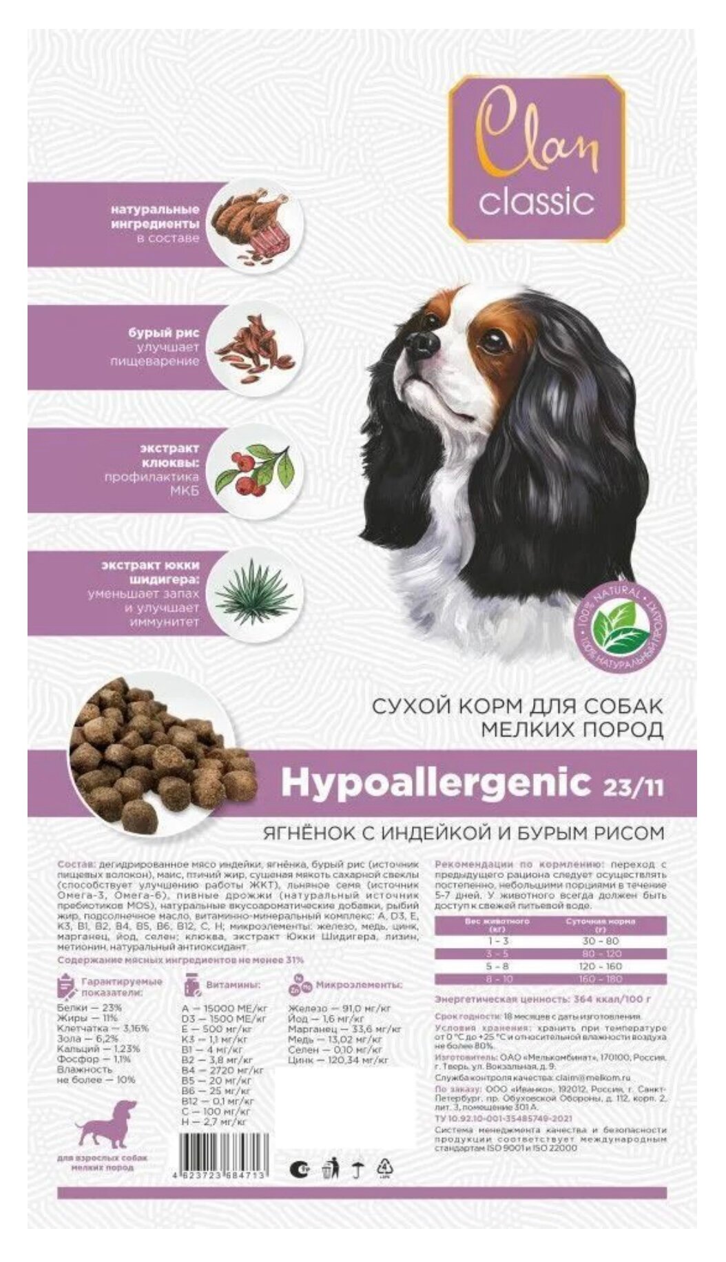 Clan (Клан) CLASSIC Hypoallergenic-23/11 для собак мелких пород, ягненок/индейка/бурыйрис 1,25 кг