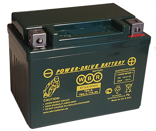 Аккумулятор WBR MT 12-4 для мототехники (12В, 4Ач / 12V, 4Ah / стартерный ток 50А) YB4L-B, YT4L-BS, YTX4L-BS