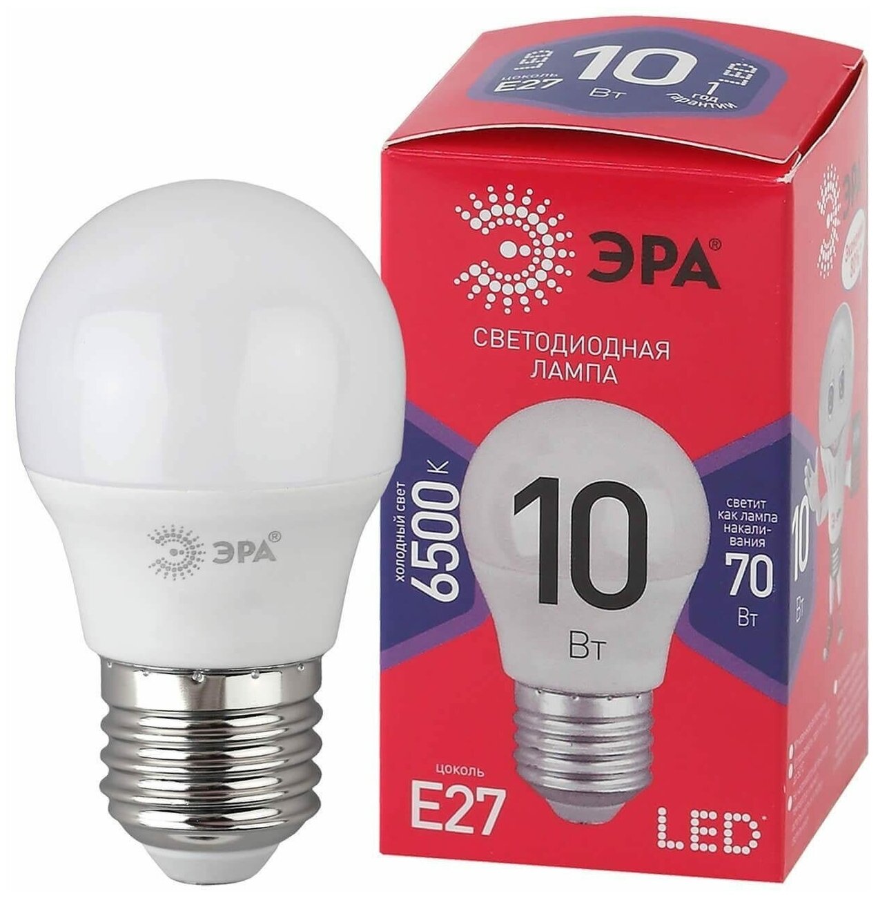 Лампа светодиодная ECO LED P45-10W-865-E27 R (диод шар 10Вт холодн. E27) (10/100/3600), ЭРА Б0045355 (1 шт.)