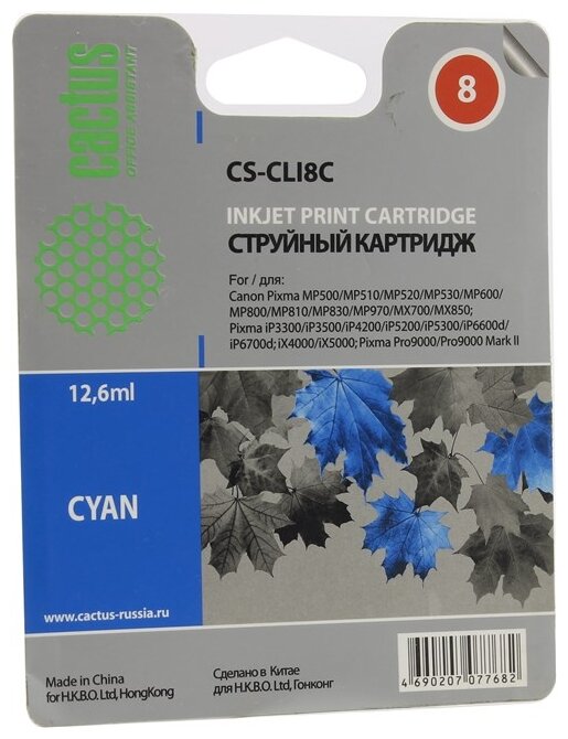 Картридж Cactus CS-CLI8C совместимый струйный картридж (Canon CLI-8C - 0621B024) 12 мл, голубой