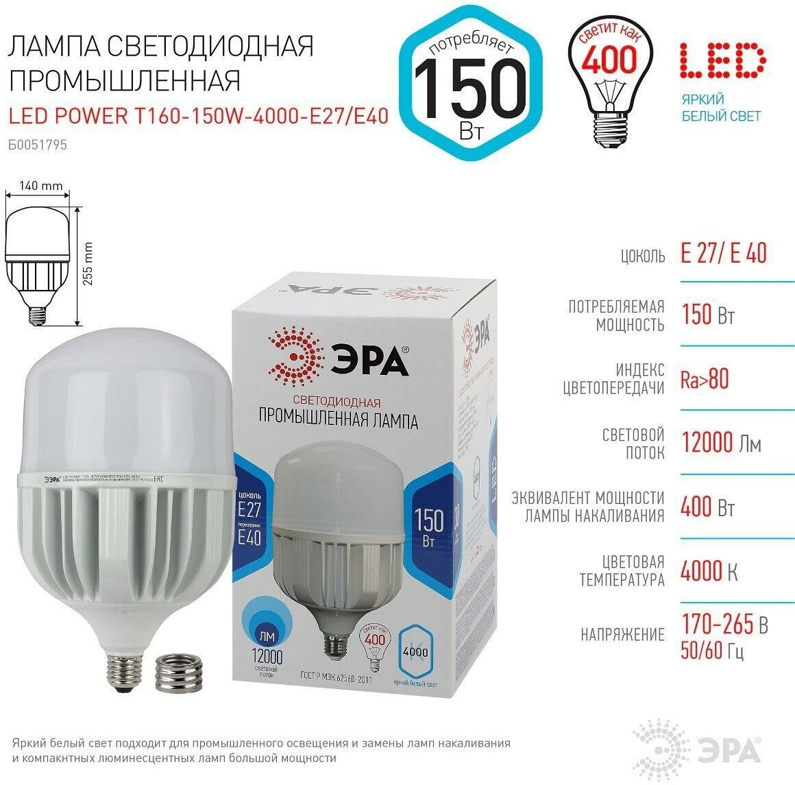 Лампа светодиодная сверхмощная ЭРА E27/E40 150W 4000K матовая LED POWER T160-150W-4000-E27/E40 Б0051795 интересное: