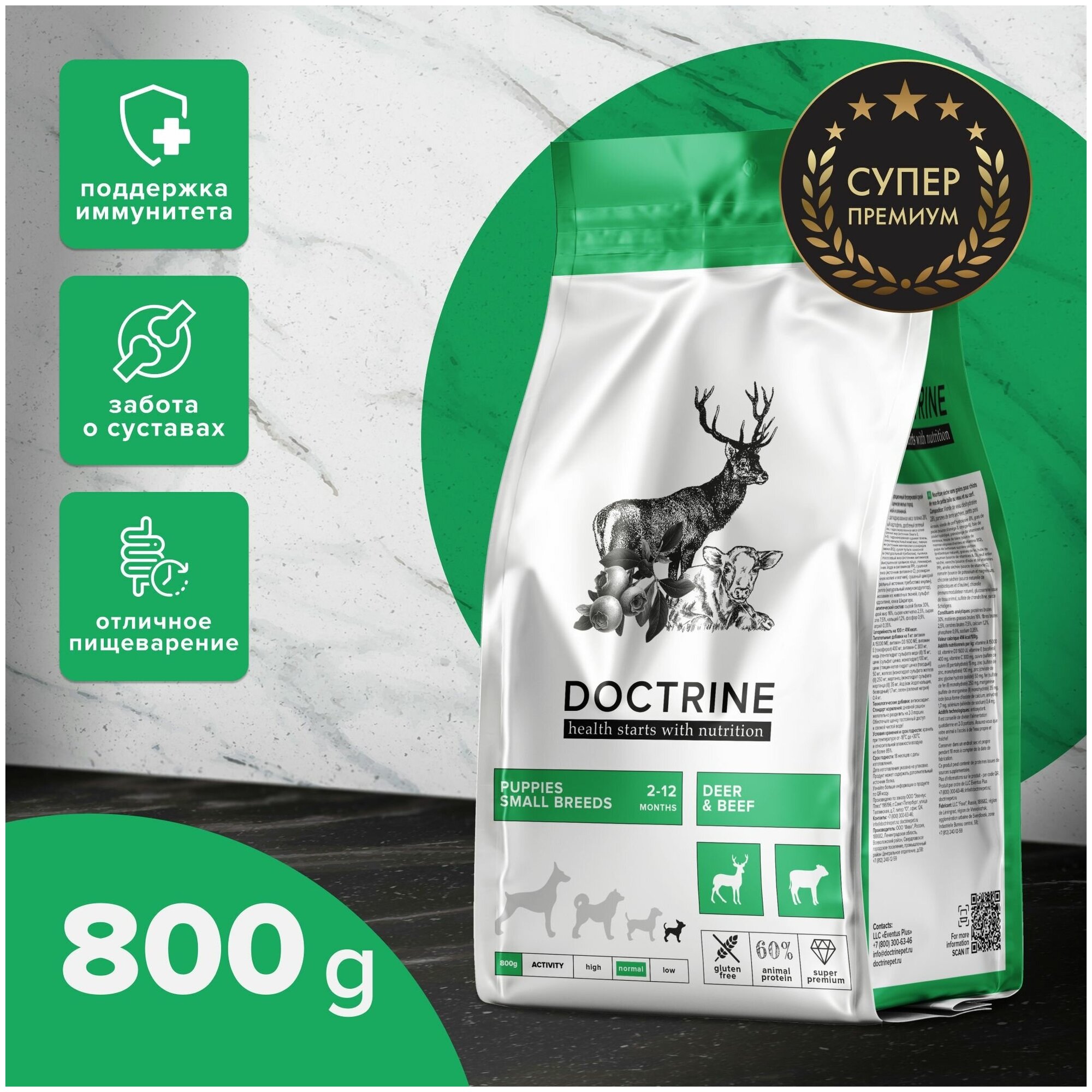 Сухой корм для щенков мелких пород Беззерновой DOCTRINE с телятиной и олениной 800г / доктрин, доктрина