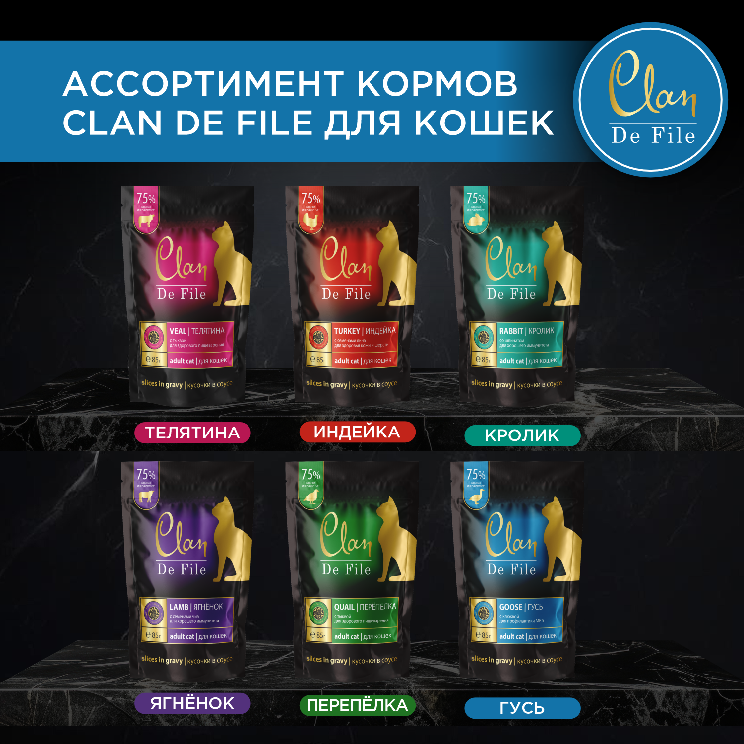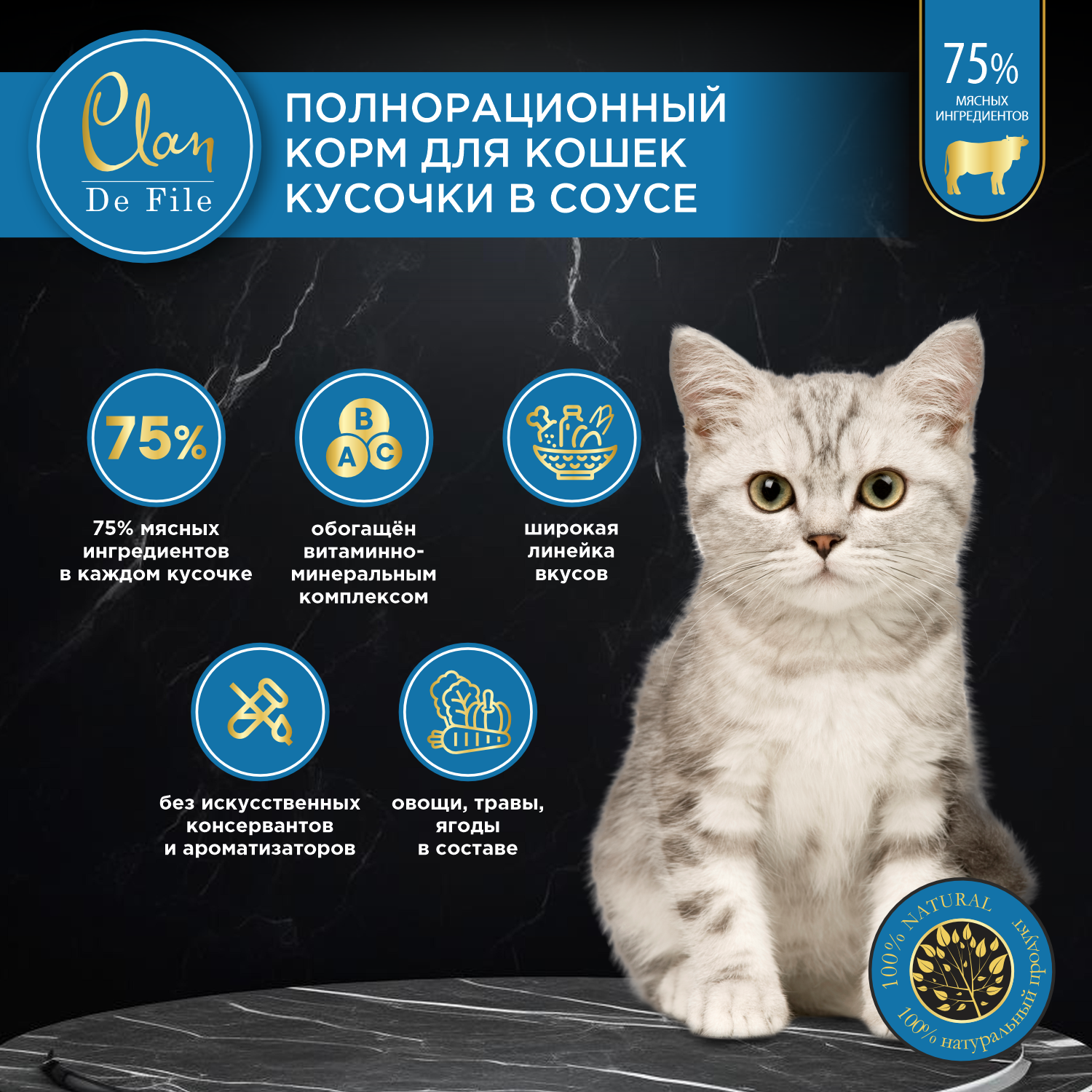 Влажный корм для кошек CLAN De File, ягненок с семенами чиа 14 шт. х 85 г (кусочки в соусе)
