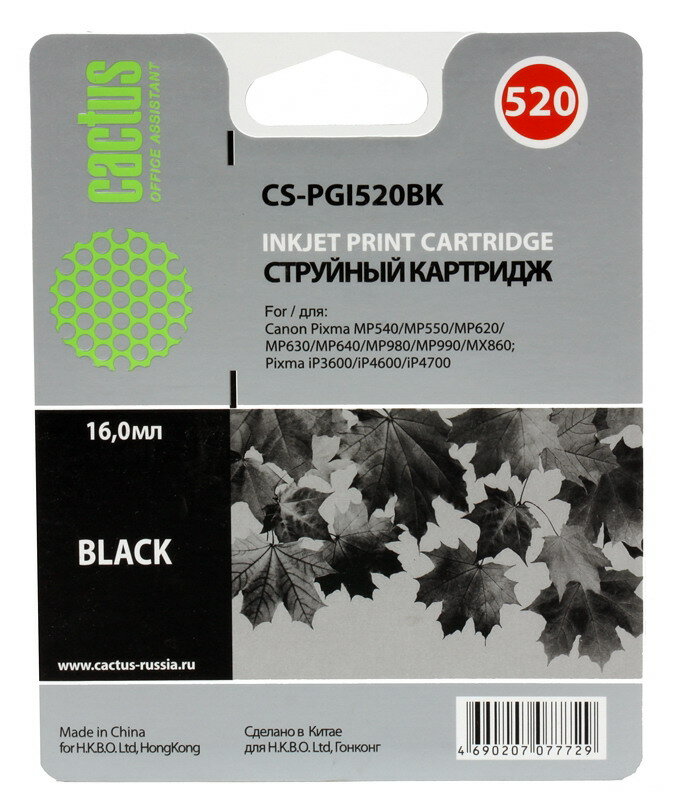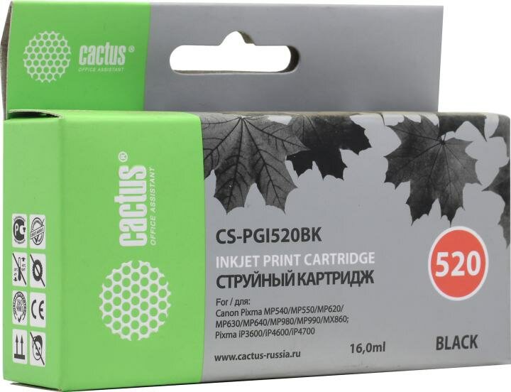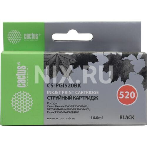 Картридж струйный Cactus CS-PGI520BK черный пигментный (16мл) для Canon Pixma MP540/MP550/MP620/MP630/MP640/MP660/MP980/MP990/MX860/iP3600/iP4600/iP4700