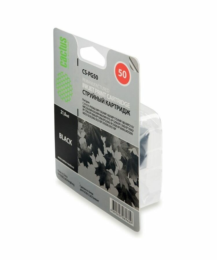 Картридж Cactus CS-PG50 для CANON PIXMA MP150/ MP160/ MP170/ MP180/ MP450/ MP460; iP2200; MX300/ MX310; JX200/ JX210/ JX210p/ JX500/ JX510/ JX510P