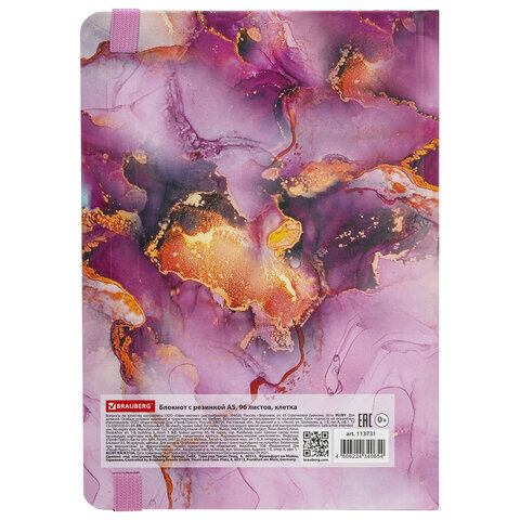 Блокнот с резинкой в клетку 96 л., А5 (145х203 мм), твердая обложка с фольгой, BRAUBERG, "Мрамор", 113731, 113731