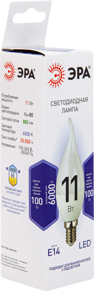 Лампа светодиодная ЭРА E14 11W 6000K матовая LED BXS-11W-860-E14 Б0032994