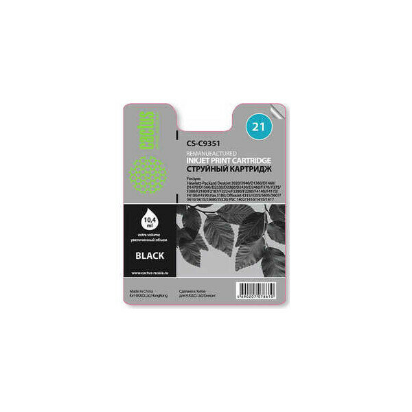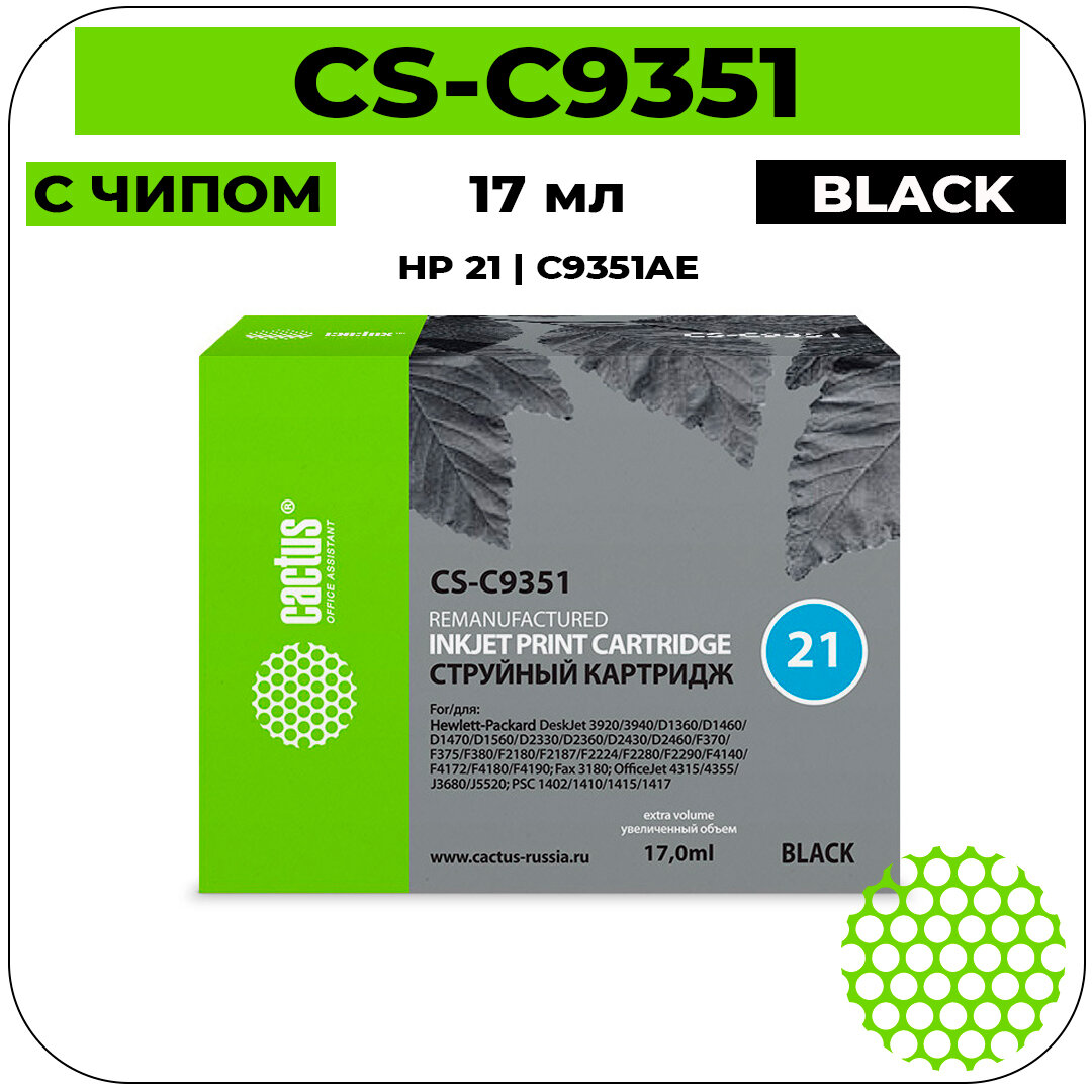 Картридж Cactus CS-C9351 №21 для HP DJ 3920/3940/D1360/D1460/D1470/D1560/D2330/D2360/D2430/D2460/F370/F375/F380/F2180/F2187/F2224/F228, черный