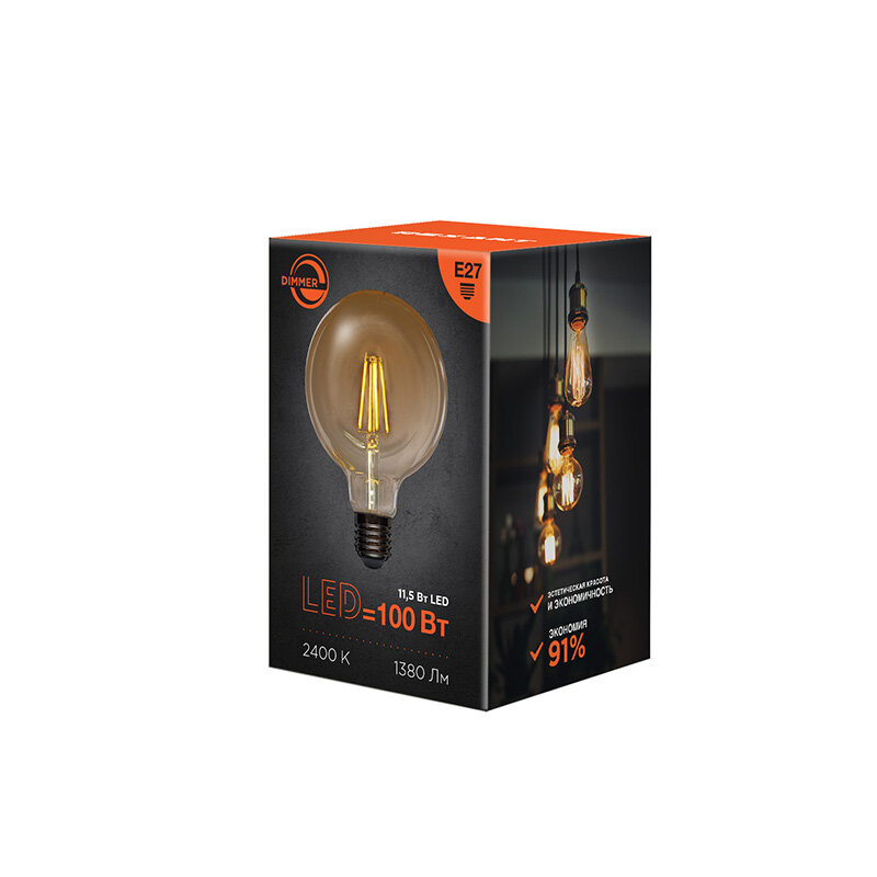 Лампа филаментная Rexant Loft Globe A125, 11,5 Вт, 2400 К, Е27, диммируемая, теплый свет