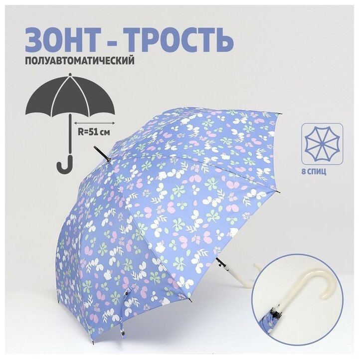 Зонт - трость полуавтоматический «Цветочки», 8 спиц, R = 51 см, цвет голубой (1 шт.)