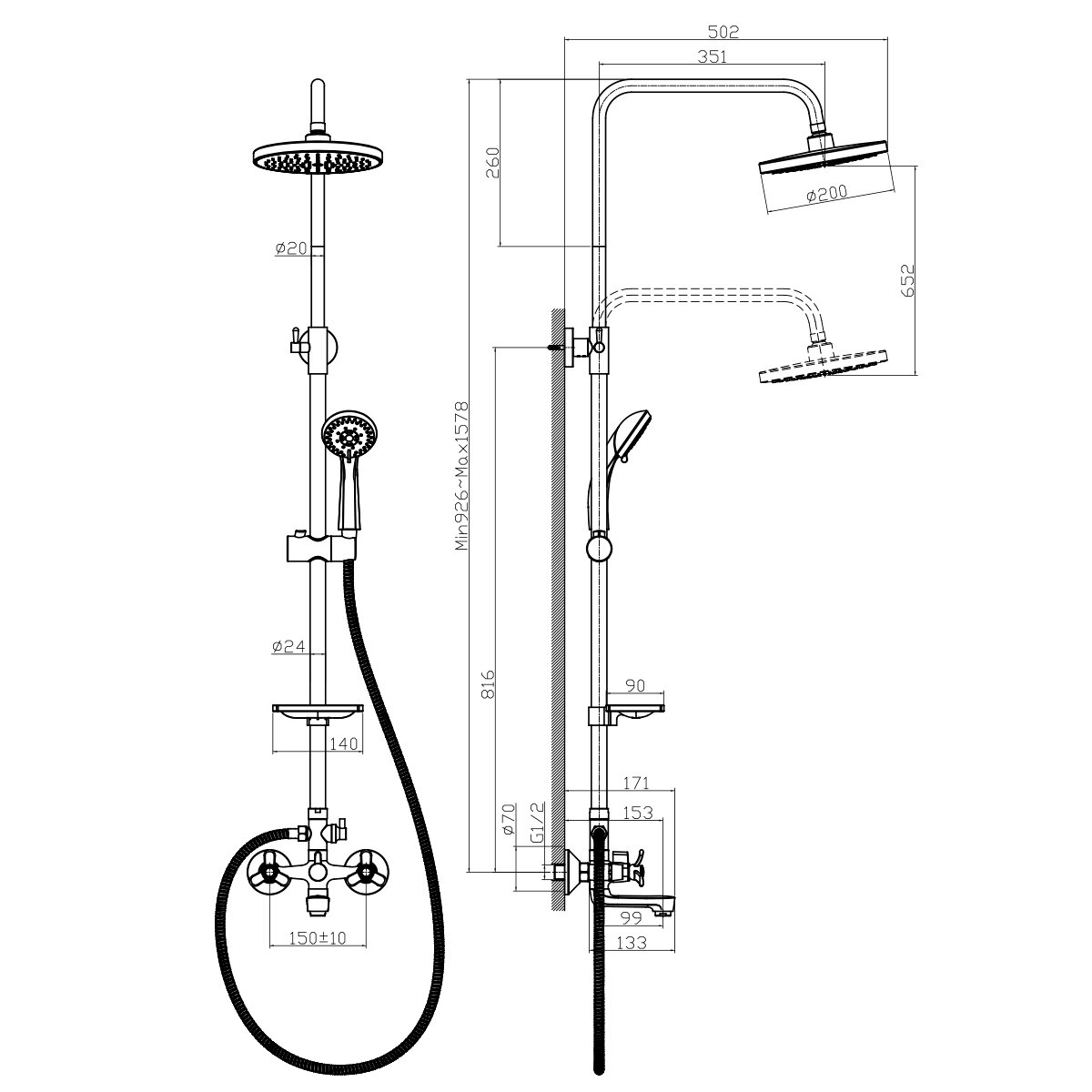 Смеситель для ванны и душа с регулируемой высотой штанги, поворотным изливом и лейкой "Тропический дождь" Q02-46 Rossinka