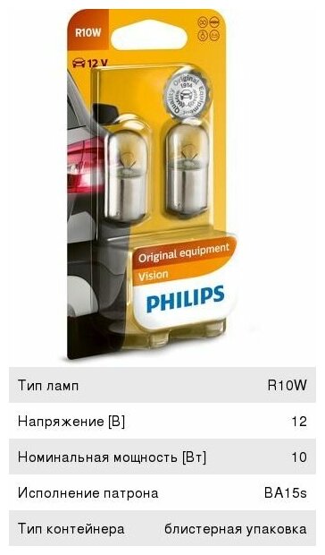 Комплект ламп накаливания блистер 2шт R10W 12V 10W BA15S PHILIPS 12814B2
