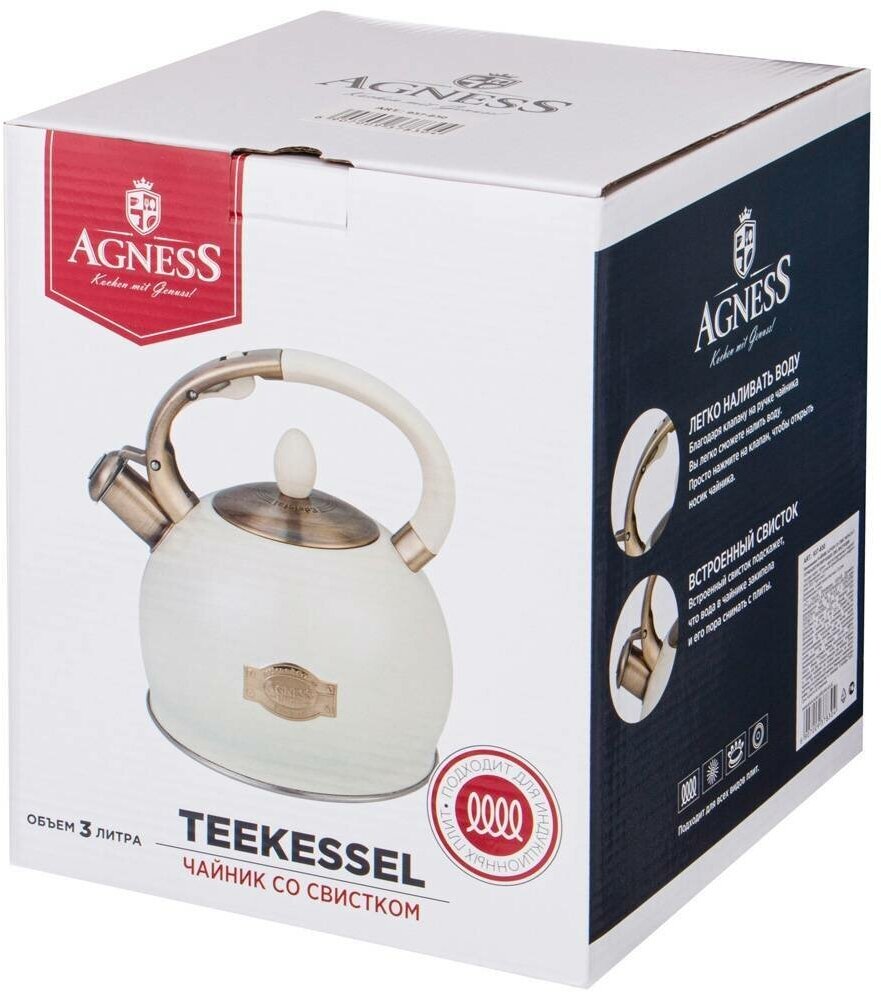 Чайник agness со свистком, серия тюдор, 3,0 л термоаккумулирующее дно, индукция