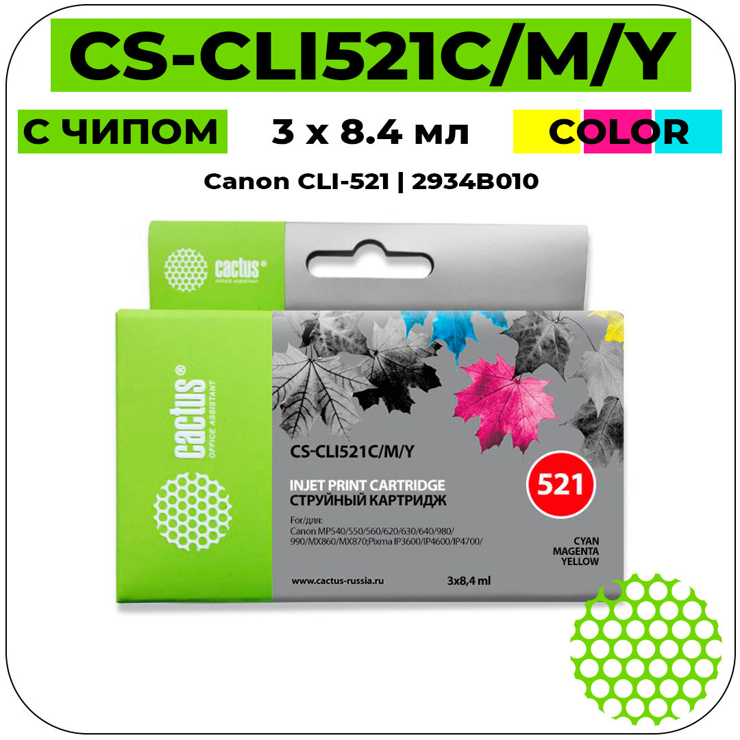Картридж струйный Cactus CS-CLI521C/M/Y голубой/пурпурный/желтый набор (25.2мл) для Canon Pixma iP3600/iP4600/iP4700/MP540/MP550/MP560/MP620/MP630/MP6