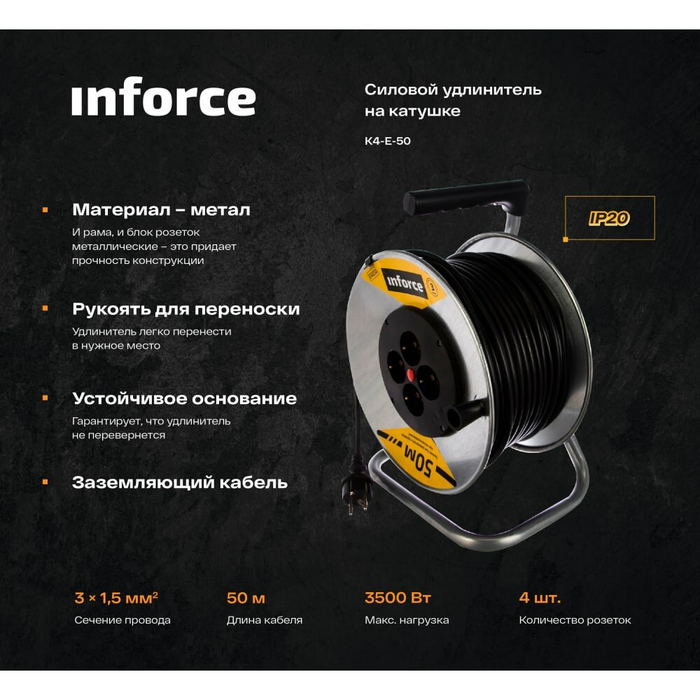 Силовой удлинитель на металлической катушке Inforce К4-Е-50 50 м 4 розетки с з/к 44150 интересное: