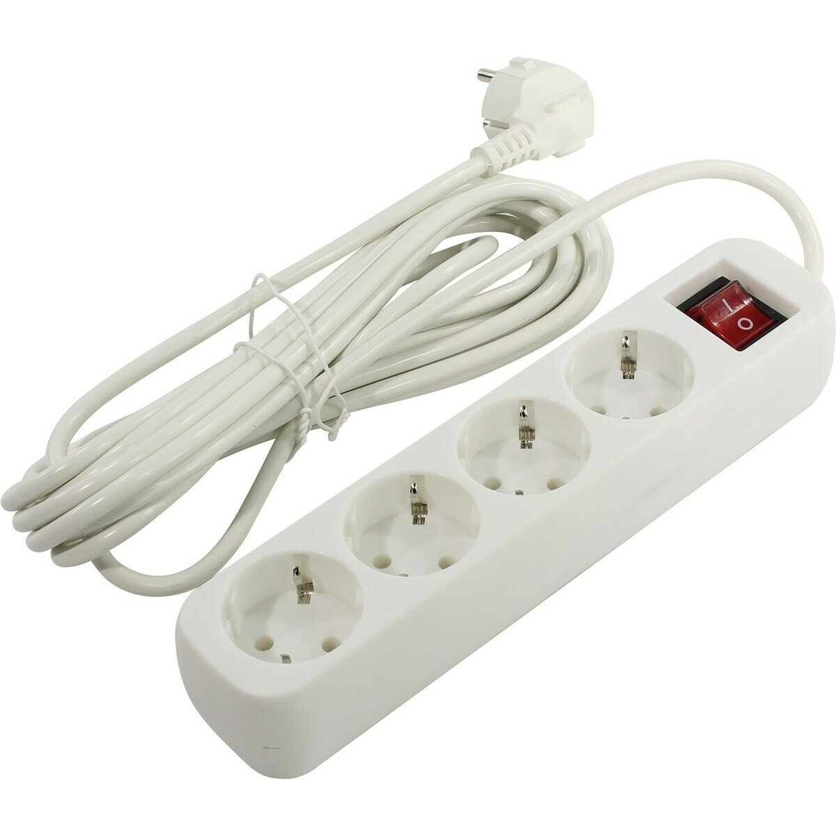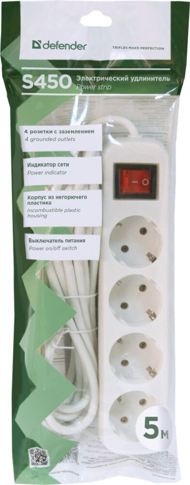 Удлинитель Defender S450, 4 розетки, с заземлением, выключатель, 5м, белый (арт. 262244)