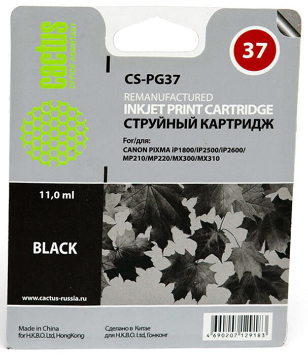 Картридж струйный Cactus CS-PG37 черный (9мл) для Canon Pixma iP1800/iP1900/iP2500/iP2600/MP140/MP190/MP210/MP220/MP470/MX300/MX310
