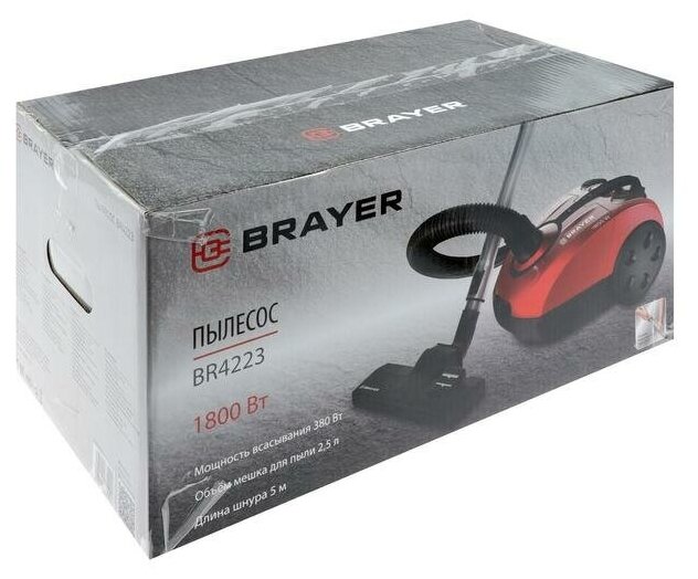 Пылесос мешковый BRAYER BR4223, 1800 Вт, сила всасывания 380 Вт, ёмкость мешка 2,5 л, шнур 5 м, красный/черный