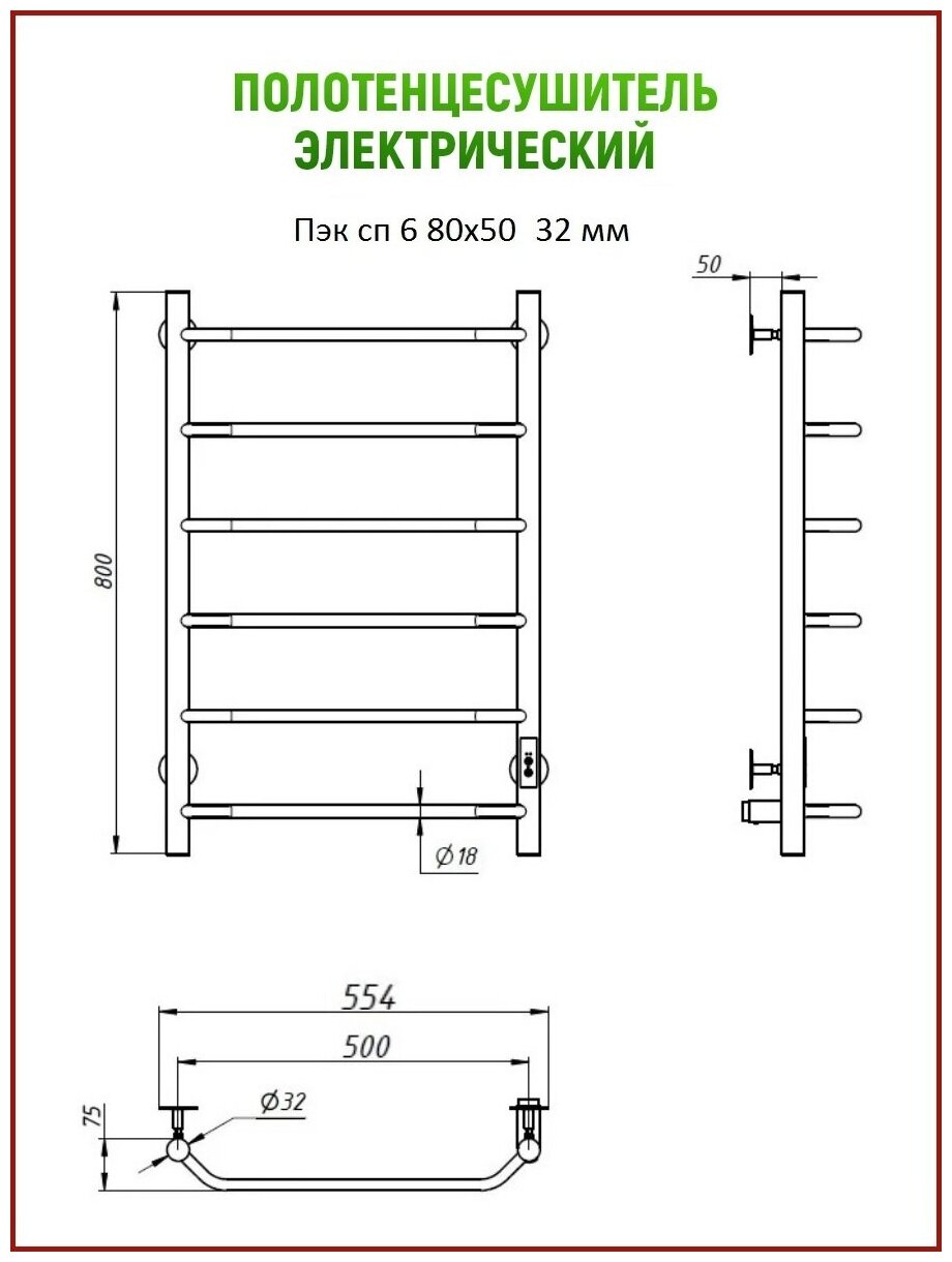 Полотенцесушитель электрический Пэк сп 6 80х50 32 мм (хром)