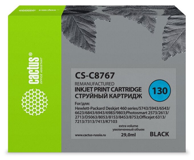 Картридж струйный Cactus CS-C8767 №130 черный (29мл) для HP DJ 5740/5743/5745/5748/5793/5940/5943/6540/6540d/6540dt/6543/6543d/6620/6623/6840/6843/6940/6940dt/6943/6980series/6980dt/6983/6985/9800series/9860/DJ 6310/6310xi/6313/6315/6318