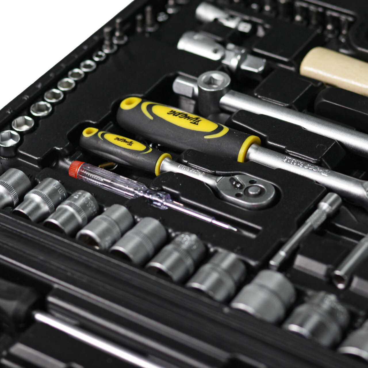 | Головки торцевые подробно | 1/4": 4, 5, 6, 7, 8, 9, 10, 11, 12, 13 мм; 1/2": 10, 11, 12, 13, 14, 15, 17, 19, 22, 24, 27, 30, 32 мм; длинные 1/4": 8, 10, 11, 12, 13 мм; свечные 1/2": 16, 21 мм; удлинитель 1/2": 250 мм; удлинитель 1/4": 75 мм; карданный шарнир 1/2", 1/4"; с битами 1/4": T10, T15, T20, T25, T27, T30, H3, H4, H5, H6, SL3, SL4, SL5.5, PH1, PH2, PH3 |