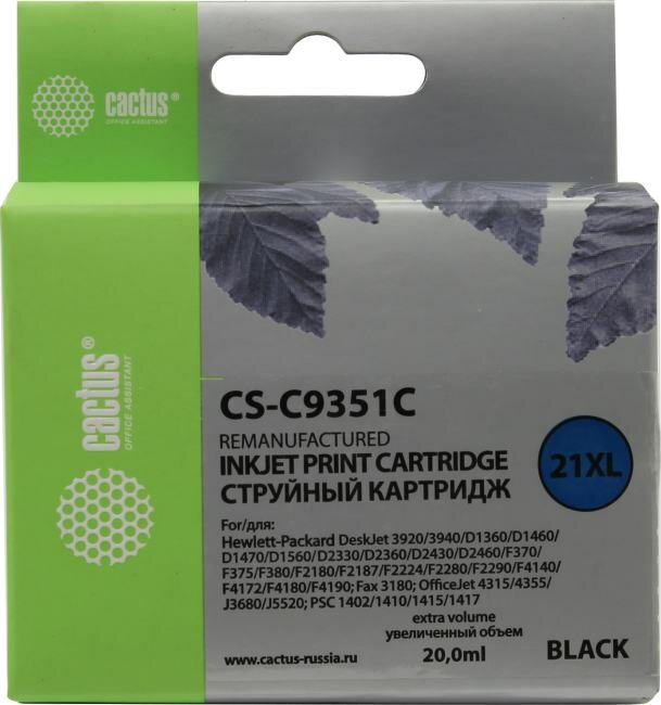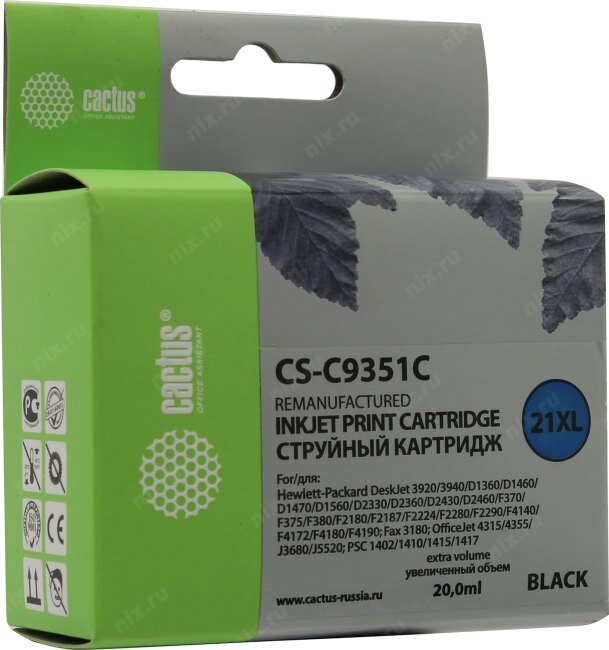 Ниже Вы можете прочитать отзывы на Картридж Cactus CS-C9351C (№21XL) Черный для HP DJ 3920/3940/D1360/D1460/D1470/D1560/D2330, ознакомится с подробными характеристиками, посмотреть интересные обзоры и фотографии на Картридж Cactus CS-C9351C (№21XL) Черный для HP DJ 3920/3940/D1360/D1460/D1470/D1560/D2330.